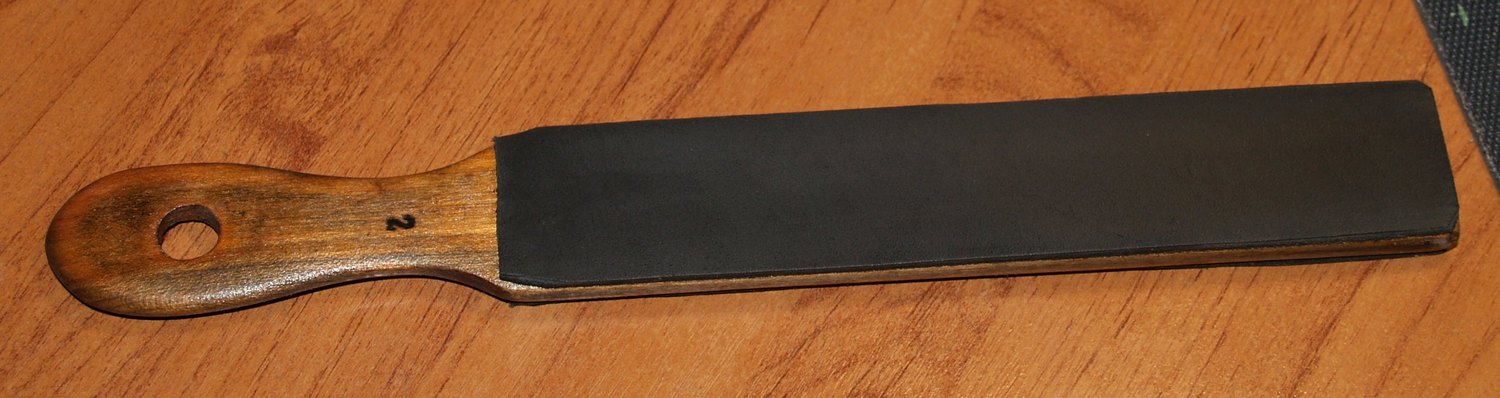 Деревяшка от старого ремня, который шел довеском к таким же старым бритвам. Кожа мумифицировалась и была безжалостно оторвана. Деревяшка была крашена, судя по всему, черной морилкой и лаком, от которых тоже осталось немного. Деревяшку вышкурил, покрыл составом а-ля даниш ойл. Кожа - шора хим дубления. Жировал, вышкуривал. Одну сторону пытался заглянцевать методом Франса. Разницы не увидел, наверно кожа не труъ. Правит ремень конечно похуже франсовского. Но на две недели - лучше чем ничего. Ремень маленький, 25 см в длину весь Муссолини харь псевдозаточкой. Типазаточник-параллельщик. Баблосгрёб.