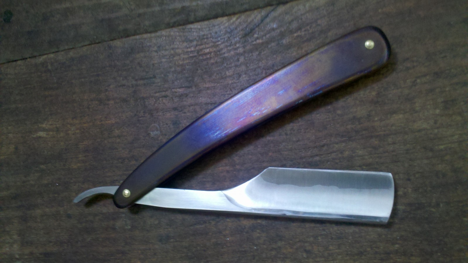 Re: Мечтаю изготовить бритвуБритва японского хирурга. Клинок - нерж "кастрюльная" , режущая кромка - нитробе77, ручка - титан немного нагретый паяльной лампой. Кованина на камисоре должна быть по определению, так что жалобы не принимаются.