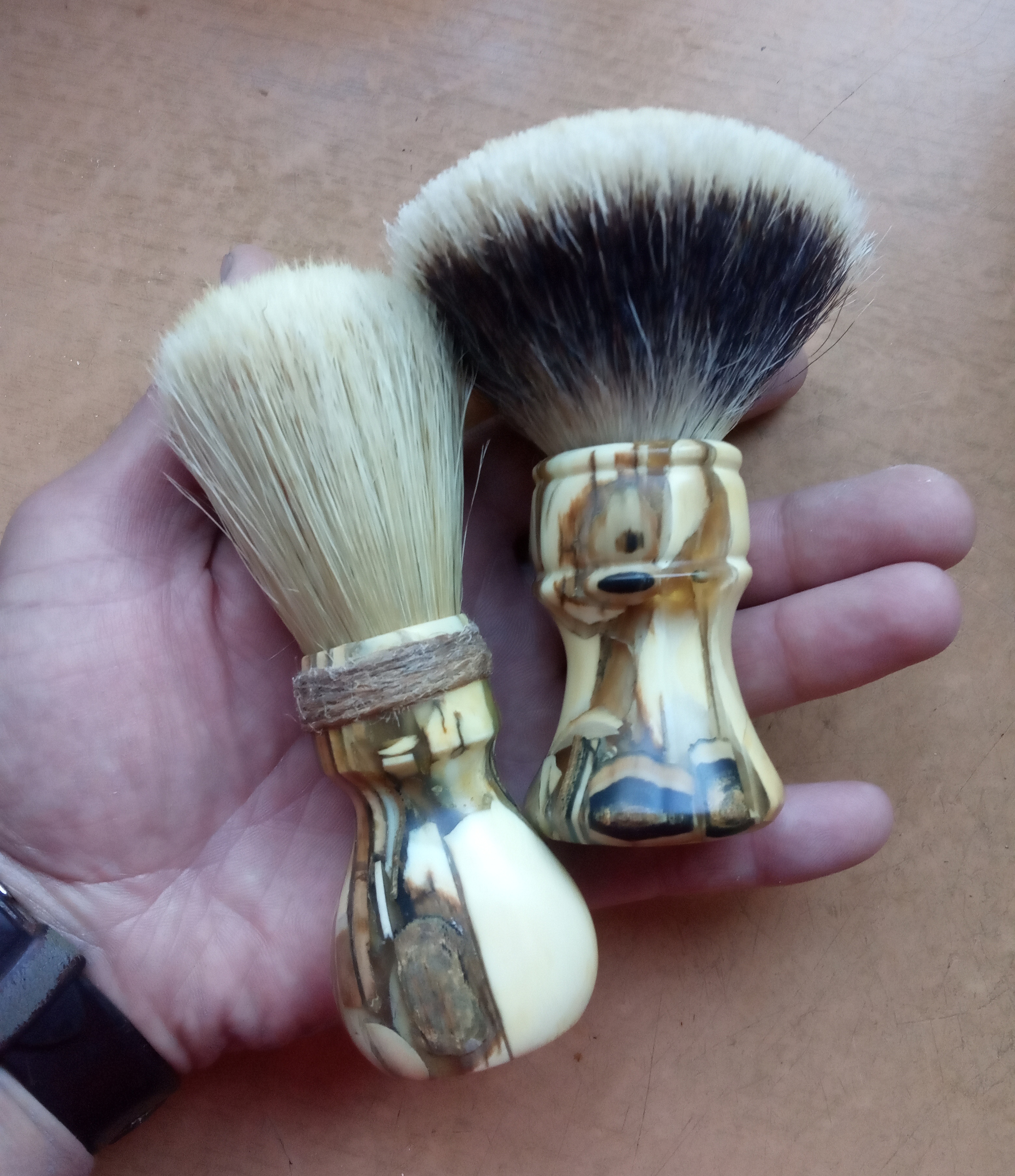 Больше года пользуюсь помазками с мамонтом на рукояти. Это очень приятно в тактильных и визуальных ощущениях. Но надо отдавать себе отчёт, что это натуральный материал и отношения к нему нужно соответствующее. Ручка не должна попадать в воду или пары воды больше пяти минут. Если на него попала вода, а это произойдёт, то нужно протереть. И работать не мокрыми руками. Иначе его попросту порвёт. Бивень мамонта содержит в себе, в трещинах и микротрещинах мел, что препятствует глубокой стабилизации. Вырезанную заготовку проливаю хорошо спиртом. Трещины заливаю полиэфирной смолой. Появляющиеся при обработке микротрещины заливаю цианокоилатом. Для защиты я использую тунговое масло, которое проникает в материал на сколько это возможно. Но даёт хорошую поверхностную защиту.
