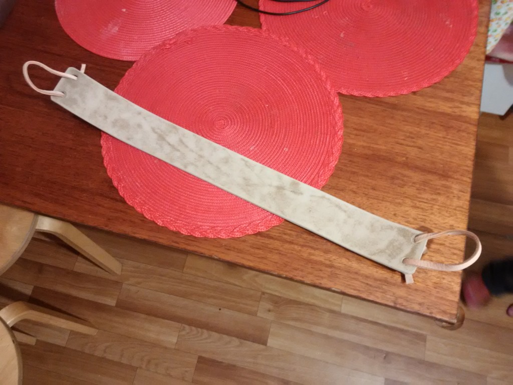 Re: Изготовление ремней для правкиВот мои труды, в другой теме писал, что перемаслил его (опрокинув баночку с маслом), но как оказалось ремень работает (как мне кажется, хорошо работает). Кожа и обвязка от Мони, фурнитура из магазина для шитья.