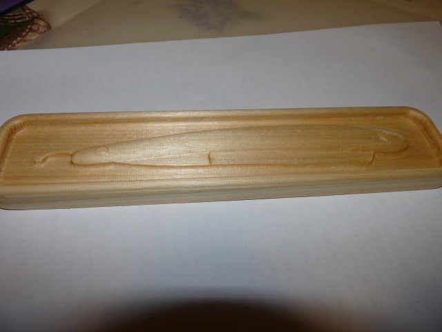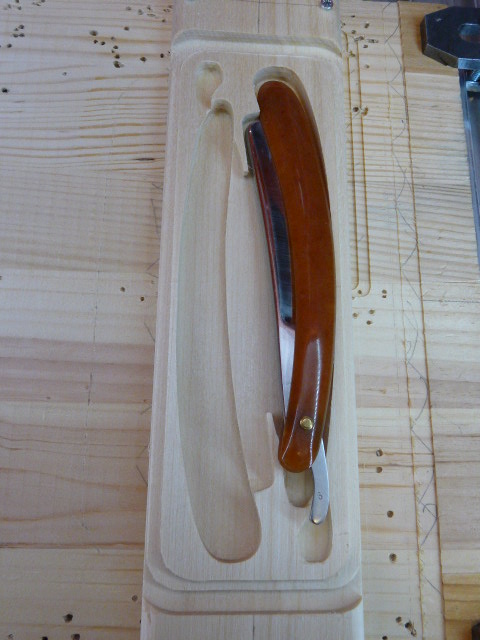 Потому путем прикидок этой пары дюжин бритв к этой "модели" разработал формы выборок (подфрезеровывая чуток там где надо и корректируя проги) и под ручки, и клины, и танги, и высоты под них всех выработал "усредненные формы выборок" под мои 2 дюжины бритовок. Так что эти формы не "просто так" от балды - это усредненные результаты натуральных замеров на осиновой модели будущего футляра. Причем исключены были только 4 бритвы из 22...24штук, по разным причинам (не вписались без визуального изменения формы выборок или больших габаритов).