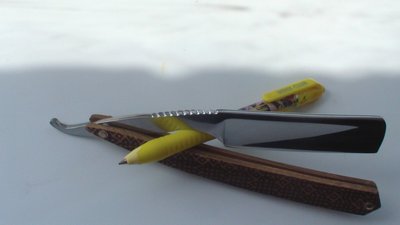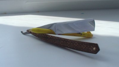 Кратко о бритве. При заказе бритвы была прислана фото бритвы Левиса со словами- "вот что то типа этого" После обсуждения появился такой вариант. Изгибы (изящество) + грубая железка( полированный сатин)При получении заказчик был доволен как форм фактором так и габаритами. Материалы У10, зебрано. закалка с самоотпуском.