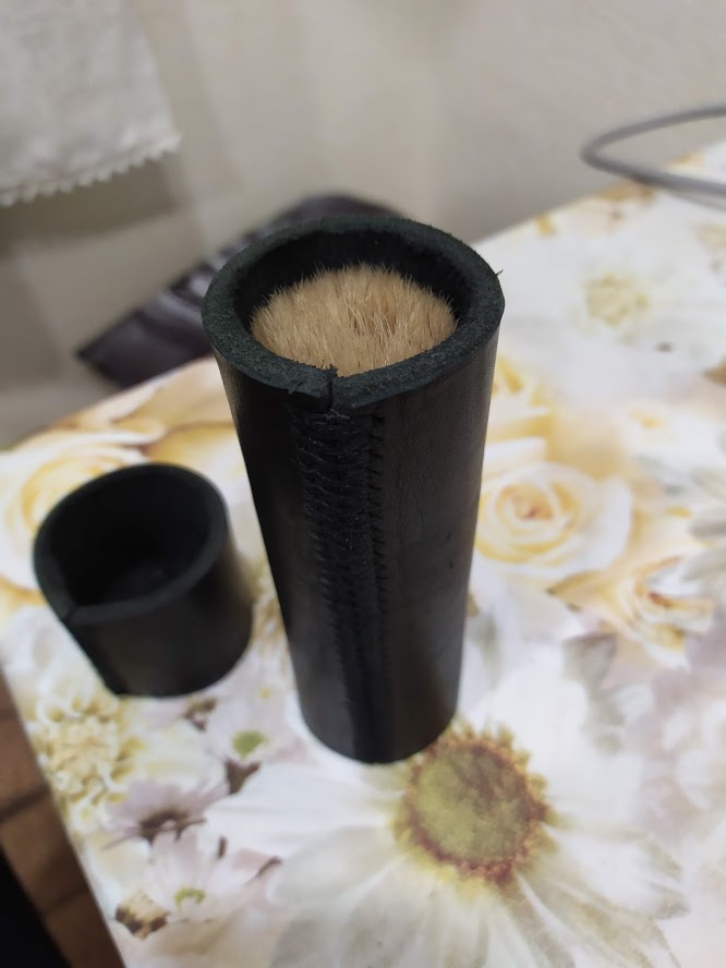 Процесс изготовления изделий околобритвенной тематикиТакой вот футляр для помазка пошил в свободный вечер из чапрака. Толщина около 5мм, нить вощеная 1мм. Дна нет. Помазок загружается ручкой вперед через верх, извлекается выталкиванием через низ. Опробован в поездках, неудобств не выявлено