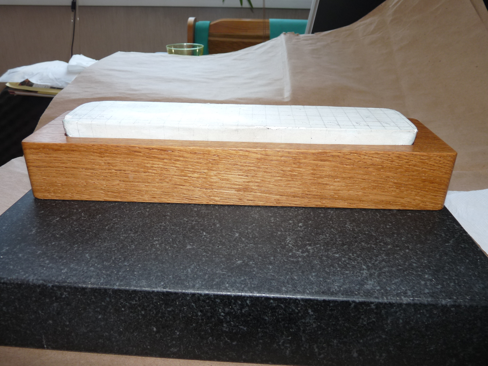 Просто попробовал, смогу/нет. (обычно, для такого дна, для самой надёжной фиксации камня, достаточно триангуляции - три точки опоры, не более, но и не менее). По высоте камня над подставкой. Запас есть - 44-18,5-15,5=10мм - толщина дна в самом тонком месте. Можно было бы ещё утопить камни, при желании, или надобности. Ну таково желание заказчика, нормально. При желании, можно шлифануть поверхность досочки (любой шлифмашинкой) - там, где есть потребность обнажить камень поболее. Чтоб ЧФ с таким рельефом дна надёжно сидел при работе на нем - само то. А вашита - (28мм толщины) - чтобы руки не теряли, инерции, мышечной памяти, ощущения одной высоты, камня (10мм) при смене камней. (ну извращение таково - уже моё).
