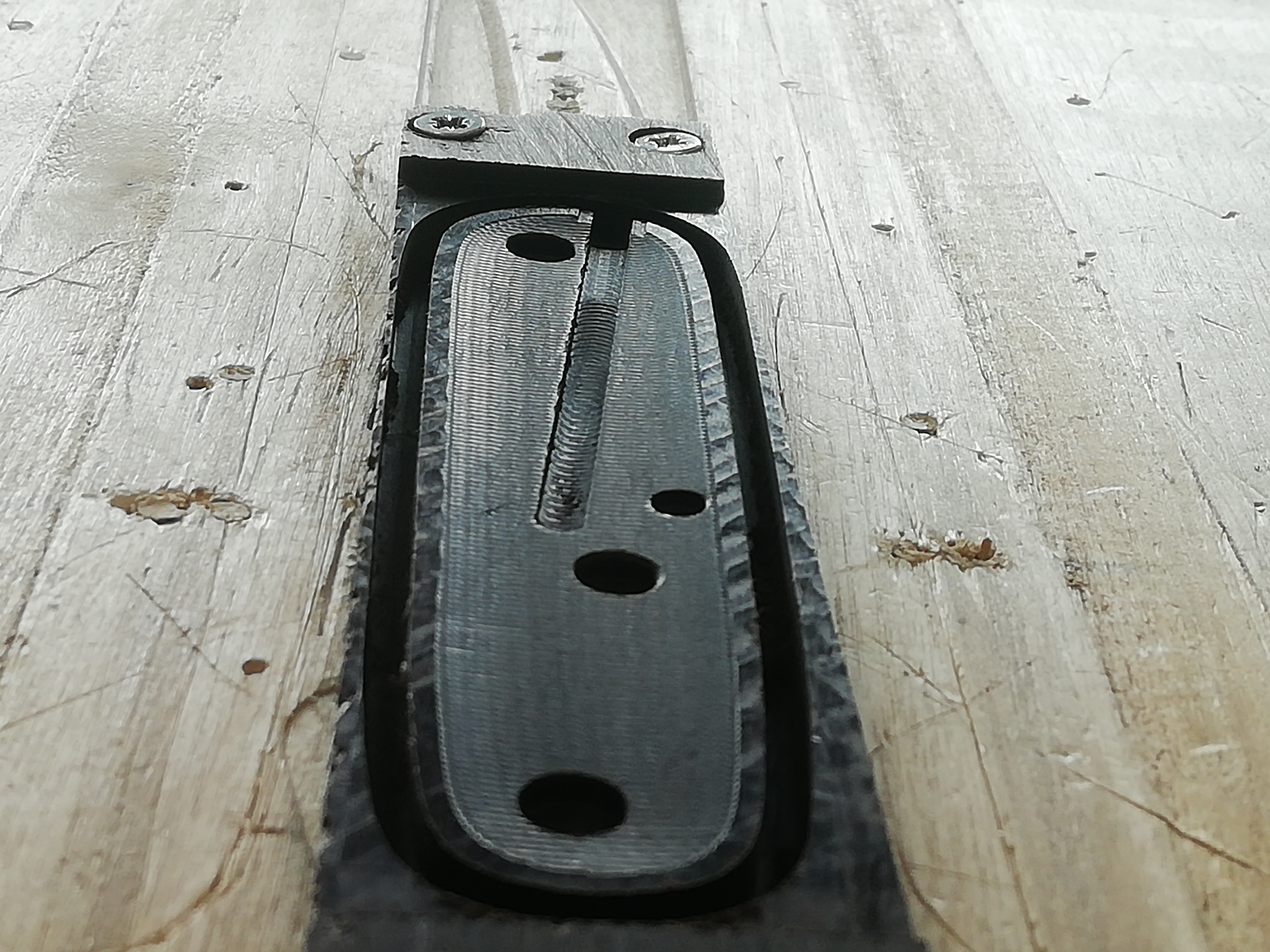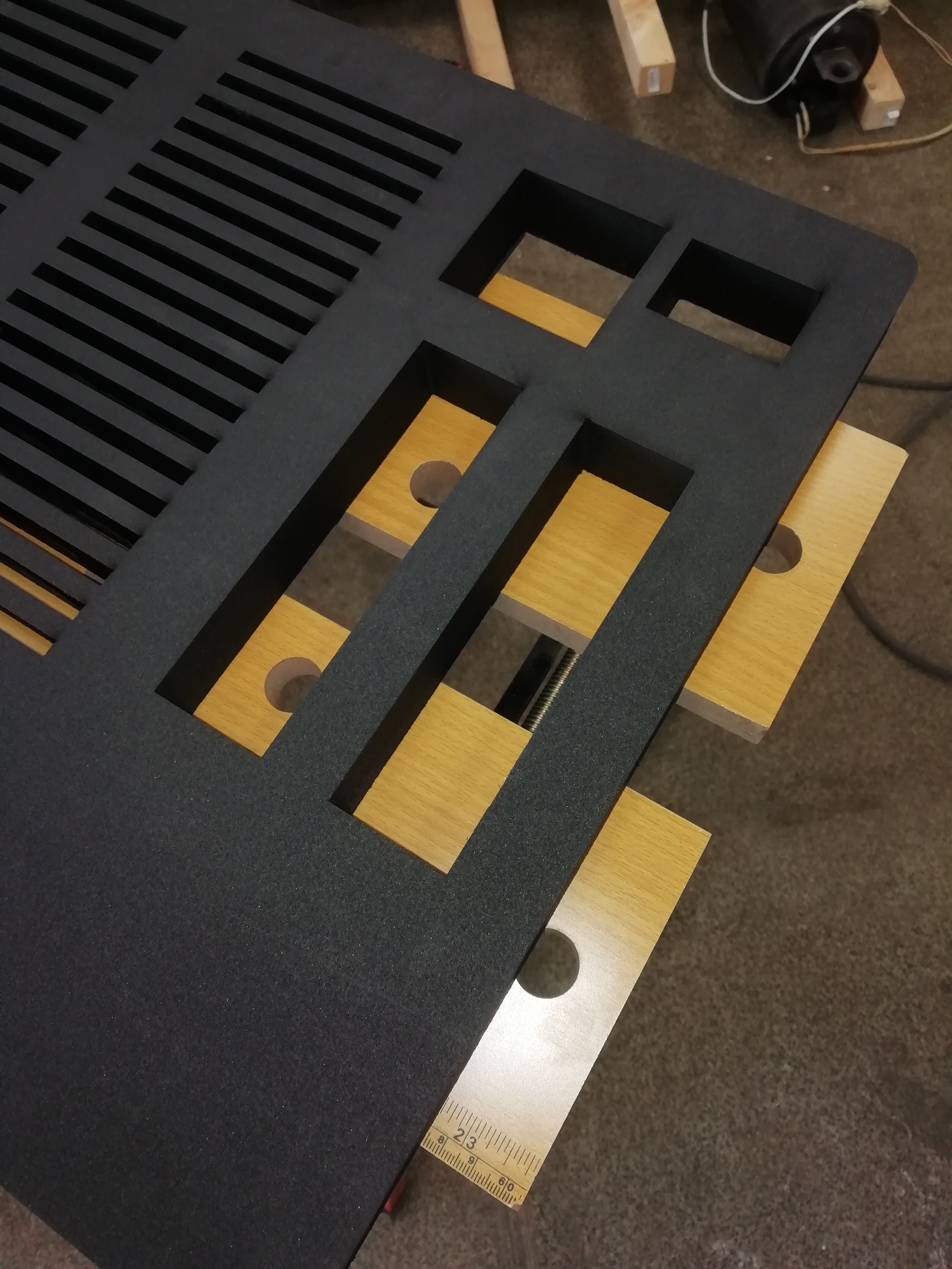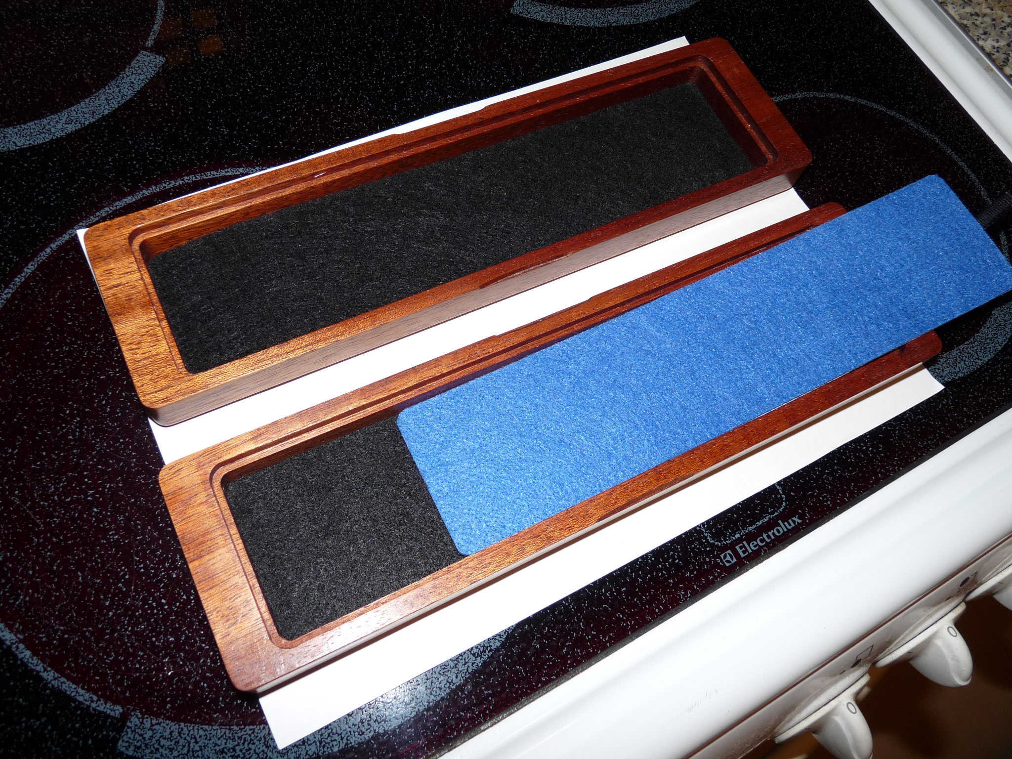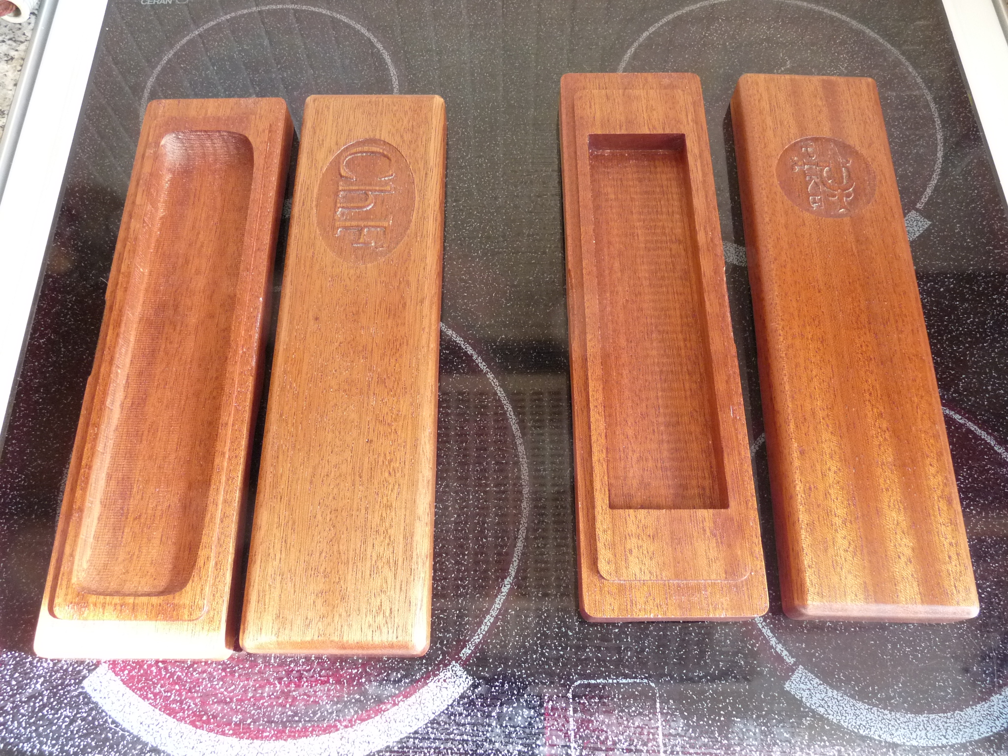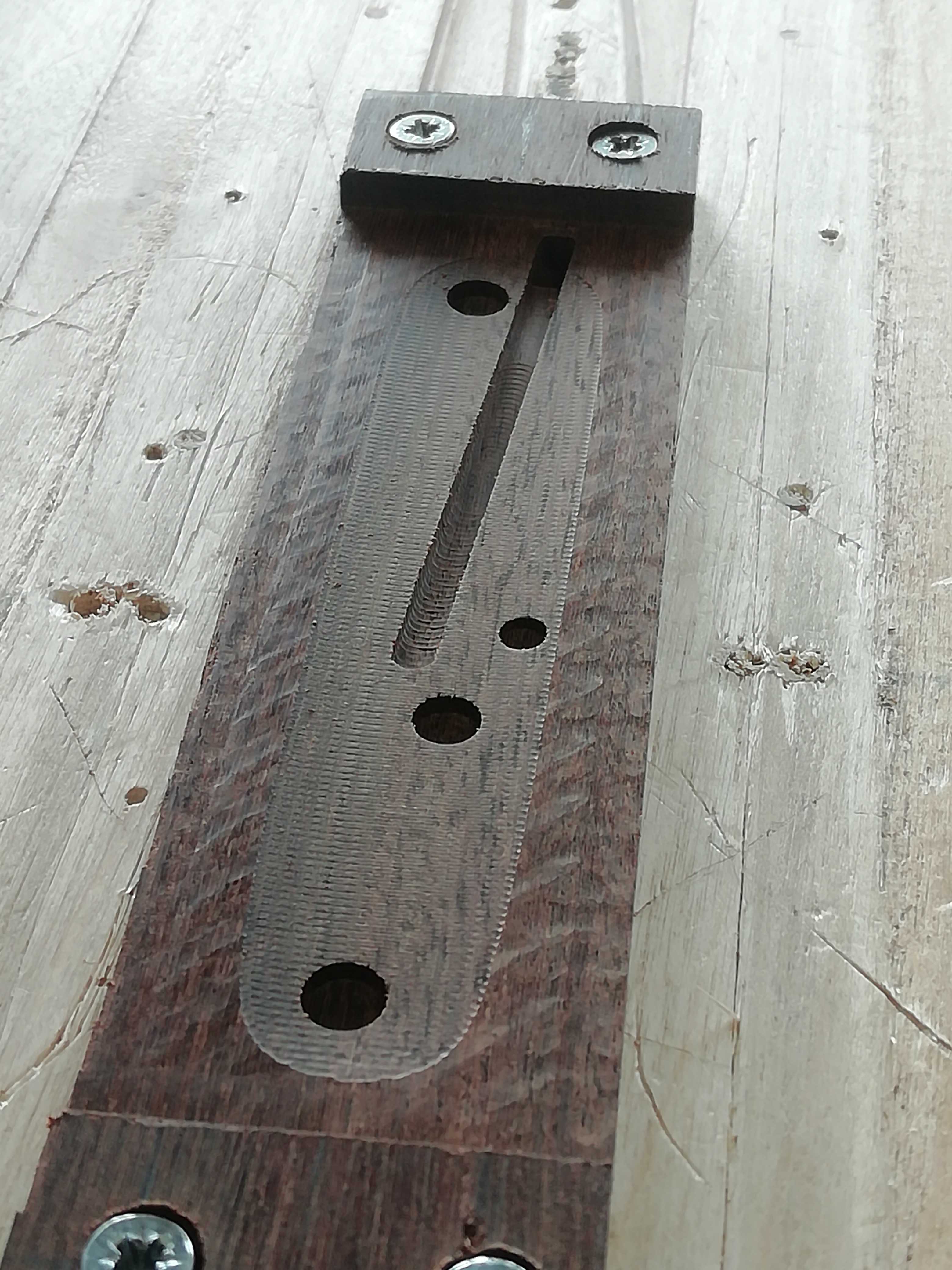 Ну начал с бука (для пробы), потом тут на фото гренадил и парагвайское железное (хотя делал и из монзо и ещё из чего то тоже твердого красного). Оси подогнал супер точно, так, что накладка вставленная неплохо держится, но снять её можно без повреждения краёв выборки отверстий. Но, всётаки нужен доп фикс, скажем неопреновым клеем капнуть на оси те же. Камрад заказал без заовала граней и точной подгонки инструментов - булавки, ручки, зубочистки, пинцета (ну сам захотел доточить по кайфу по месту). Потому толщину оставил +0,2мм и/или +0,4мм толще оригинальной толщины (3.4мм) накладки. Отсюда и пОрты инструментов не везде открылись, ибо вырезы были сделаны на макс глубине 3,6мм. В общем - флип это всё, но мОгем.