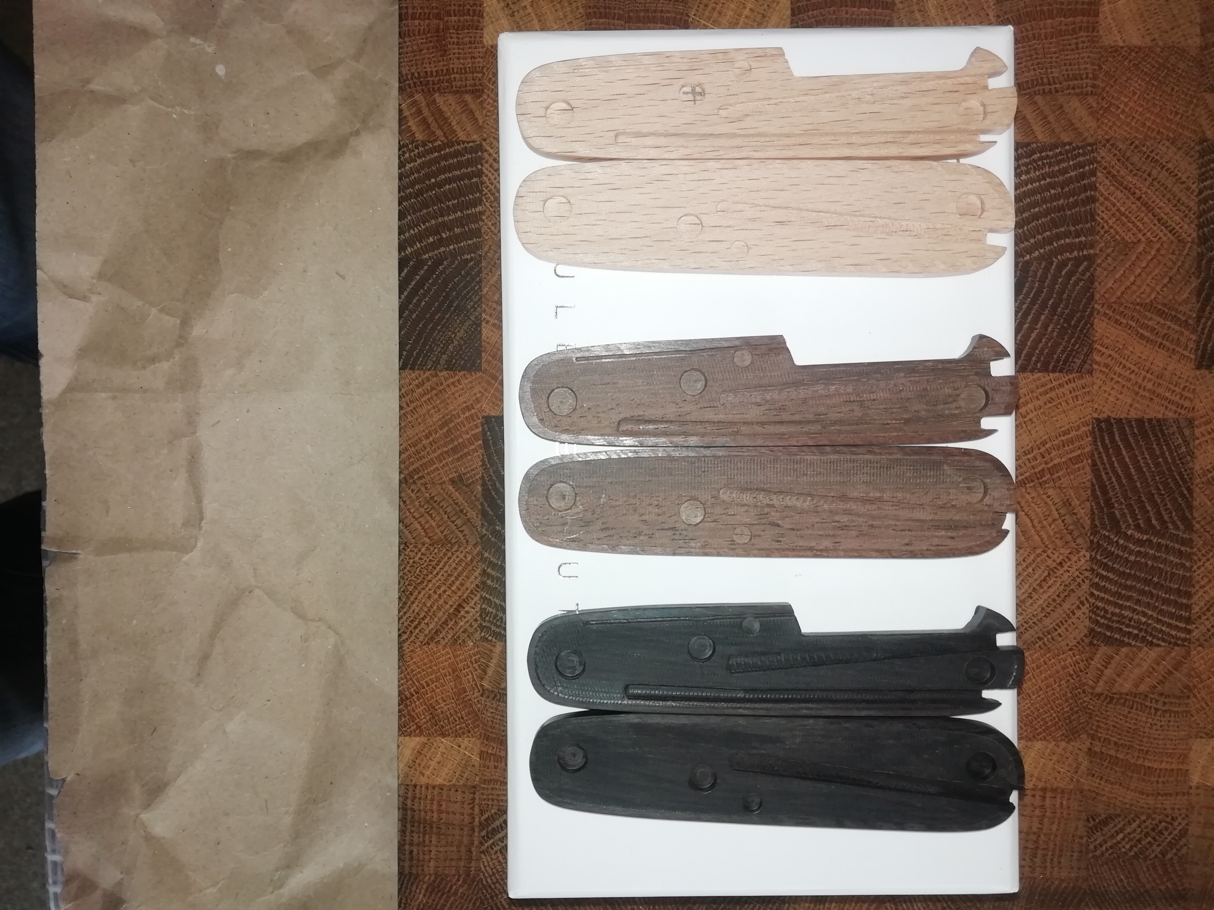 Процесс изготовления изделий околобритвенной тематикиА вот накладочки для Викса-91 (Victorinox 91мм) сделал из экзотических пород деревьев.