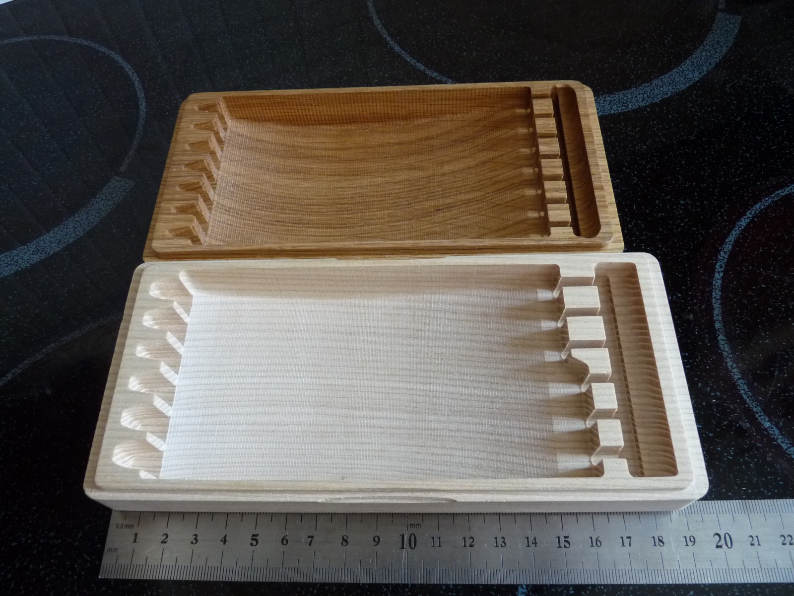 Кофрик на 6 бритв, 3 побольше (ручка - 145мм) + 3 поменьше (ручка - 140мм). Дерево - ясень. Высота рельефа бритовки - 2,538мм по нижнему пину. Примерил бритовки, спецом взял 5 черных и 1 белую, ибо фетр взял черный (гурманю тут вишь ли Кофрик вышел чуть уже и чуть длиннее дубовой "недельки", что была выложена выше, зато вырезы под хвосты для нижних пинов были увеличены для того чтобы могли влезать кроме утончённых слоновых хвостов англов и советских в расцвете бритв. Да и длина под ручки тоже немного больше. Но всё же это 5/8 и 6/8, однако 4/8 там утонут - не пойдут. Предотпускной каприз эдакий. Золотое сечение... PS фетр просто вставлен, не закреплён, ибо ещё не доработано. последнее фото - те самые вырезы (ещё не ошкурено) - видна ступенька - верх обработан конической фрезой, книзу - обычная сферическая цилиндрическая. И разные размеры вырезов - с краёв побольше, к центру поменьше - симметрия... И виден рельеф дна короба - тоже рельефная выборка, повторяющая изгиб ручки бритвы. Кстати рельеф дна, как и рельеф крышки изнутри можно сделать тоже волнистым - бритва как бы лежит на дне волны и волной (крышки) прикрывается Ну понятно, что волна крышки будучи прикрыта фетром будет выглядеть как волна фетра... (волна вдоль ручки бритв - 6 бритв = 5 волн + 2 полуволны, объединённые со стенками), для удобства фиксации бритв в закрытом положении коробки, ну и для красоты для (или это излишне?). PSS Кстати,футлярчик из сушёного ясеня с шестью моими бритвами и фетром весит 501грамм, без бритв = 230грамм. При этом это вес до обработки маслом.