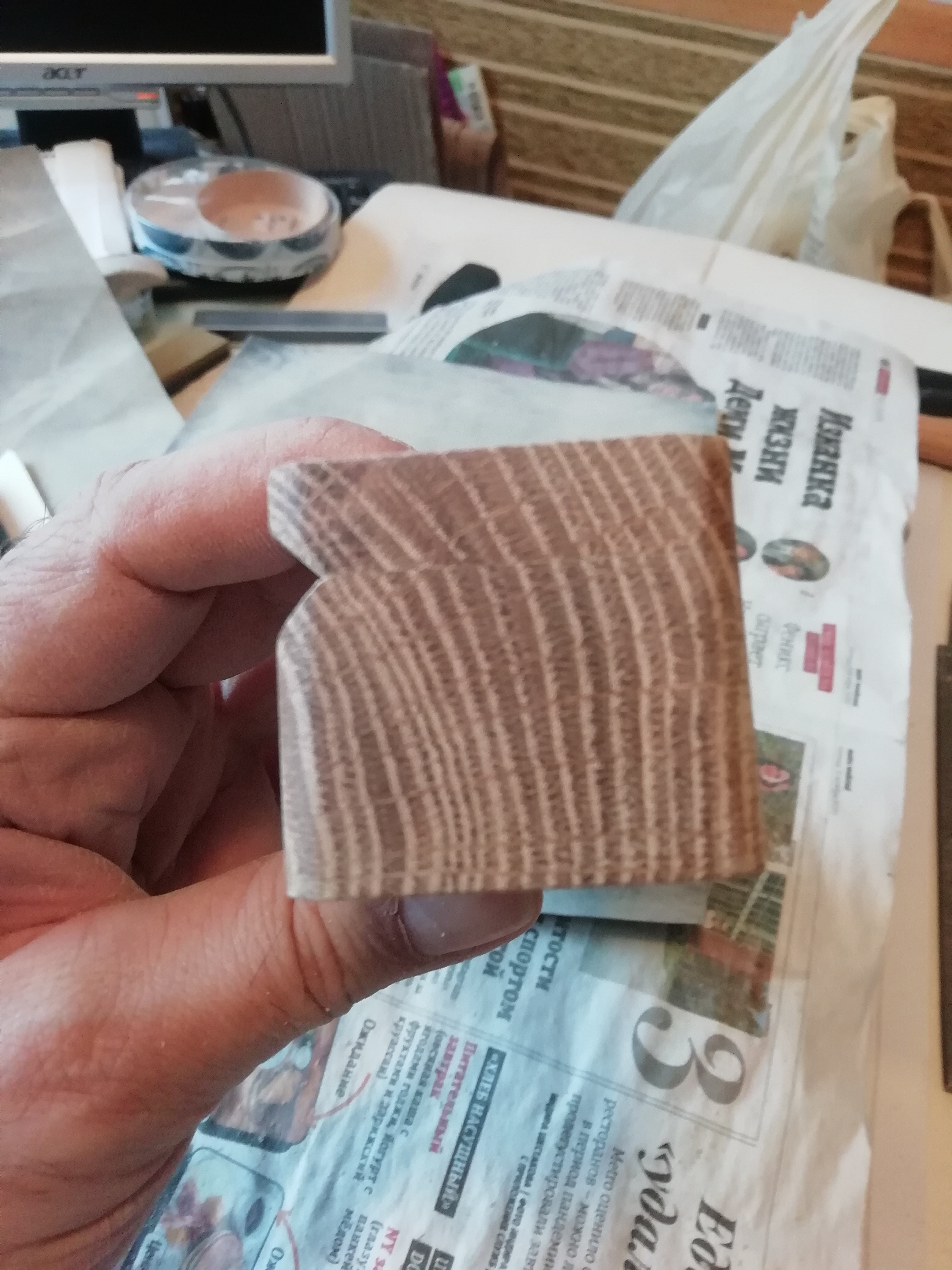 Ну вот футлярчик для не совсем бритвы, но тоже острая вещь - для Busse Combat American Kensei 47 (AK-47) Wakizashi, 2005. Явное ХО. Азотировано-ванадиевая сталь INFI (клинок сгибается вбок до 35 град без повреждений, при 58...60HRC!), длина шашечки\сабельки\ножичка - 29" (74см, ну прям длинная для меня). В общем это один из шедевров УСАшных ножеделов от уважаемого производителя. И потому, как я понимаю, это чистый вечный полочник. Потому и футлярчик делал очень внимательно, старался, чтоб он коррелировал с помещаемым внутрь предметом. Материал - дуб склейка с покрывными ламелями - 40мм толщины. 920 х 110 х 69 мм - габариты футляра. ТикОйл, Воск затемнённый Либерон, китайская и итальянская латунная фурнитура, зелёный бархат, поролон ППЭ, ППУ, стекло - акрил (Плексиглас), неодимовые магниты, фетр. Общий вес футлярки около 5...6кг, если с ножиком, в общем тяжёлый, как камрад захотел. Сабелька держится внутри футляра на 3х прямоугольных магнитиках, при их общем усилии около 10кг. (или более), что позволяет, в том числе, переносить футляр с зафиксированной ими шашкой-вакидзашкой внутри (и даже трясти футляр). Футляр стоит на 5 ножках 7х16х50 R6 мм, которые врезал на 3 мм в выборки корпуса, снизу ножек - фетр. Выношу на ваш суд, соответствует ли исполнение задаче (любое мнение интересно)?