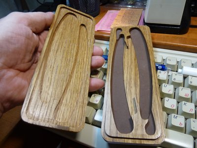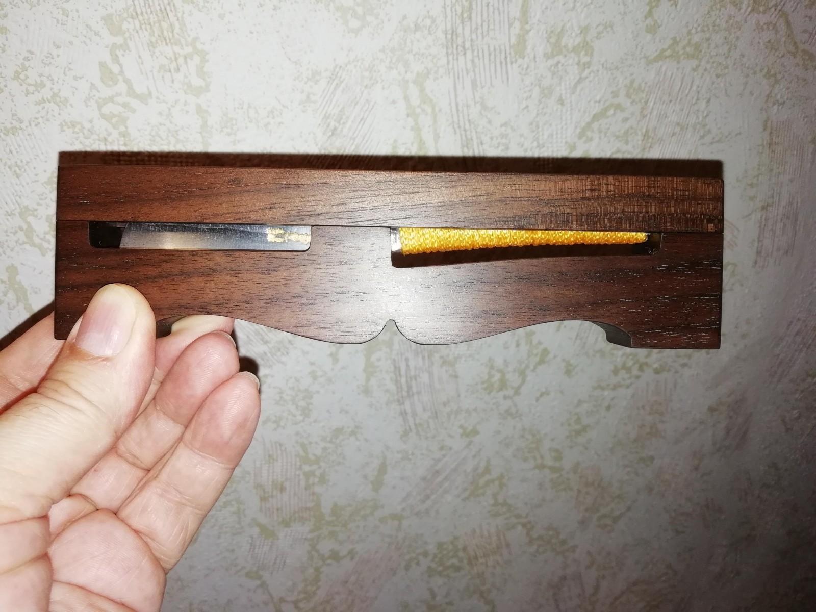 Некий авангардизьм, который, как мне кажется, возможен при изготовлении футлярчика для камисорьки, ибо нет особо устоявшихся взглядов на это дело. Получился почти стиль типа "арт - деко" (https://ru.wikipedia.org/wiki/%D0%90%D1 ... 0%BA%D0%BE" onclick="window.open(this.href);return false;) . Материал, вероятно благородный орех, возможно американский, оружейный/ружейный, но хорош и в обработке и в ощущениях. Опять же тут показаны все этапы изготовления от схемки и деревяшек до получившегося итога. Камисори должна фиксироваться своим хвостиком, шейкой (в корпусе) (ну и намоткой ручки тоже L= 72,5мм) и двумя точками - верх хвоста и горб клинка у крышки (такую высоту положения бритвы в стоечках сделал расчетно). Если этого недостаточно будет, то можно проложить внутри крышки фетр нужной толщины (но, возможно этого уже и не нужно будет). Высота в закрытом состоянии - 46,7мм; ширина 20,2мм; длина у всех моих футляров, как правило = 180мм.