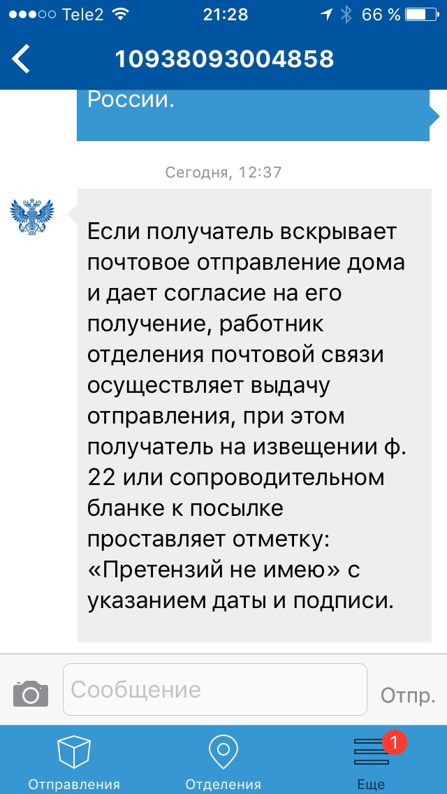 Зашел на чопту, а мне "мы работаем только по извещениям. До свидания." Начал пыхтеть, мол че за фикня, почему так долго идет, уговорил, посмотрели треки, ответ: "Ну наверное мы еще обрабатываем. Народу мало, посылок и писем много. Ждите извещение". Вот такая грусть Перестаньте тереть, не успеваю выделять смазку !!!