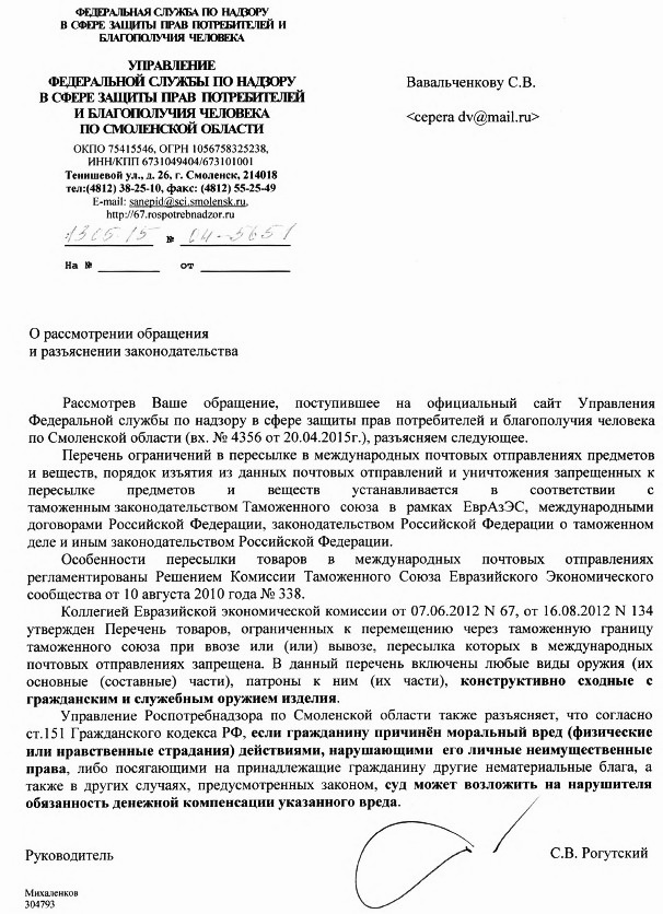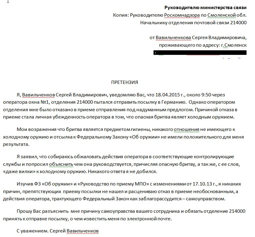 Только Министру Связи и копии всяким мелким начальникам, чтоб знали суки кто на них настучал. В Роспотребнадзор бесполезно. Они там сильно огорчаются, когда у них над головой расходится окно в ряске и светит сквозь него солнце. Я отправлял как то baa в Германию бритву, так на главпочтамте в Смоленске вышел казус. Признали в бритве нож Боуи. Попытки возражать, привели к стягиванию к окну оператора всего персонала отделения, размахиванию руками, брызганью слюной и утверждению, что я верблюд. Я сказал:"Ладно, кобыла, я те ща намажу. Жди привета от министра". И пошел писать жалобу. Накатал три телеги Министру, начальнику ПР, начальнику ихнего надзора и в Ростелеком. Первым ответил Ростелеком, типа гражданин вы чудак. Почта всегда права. Потом ответил министр. С извинениями. Что меня устроило. Пошел и отправил бритву без проблем. Кобылу борзую, кстати уволили. Моя переписка с козлами: 32 года активно мусолю харю клинковой бритвой