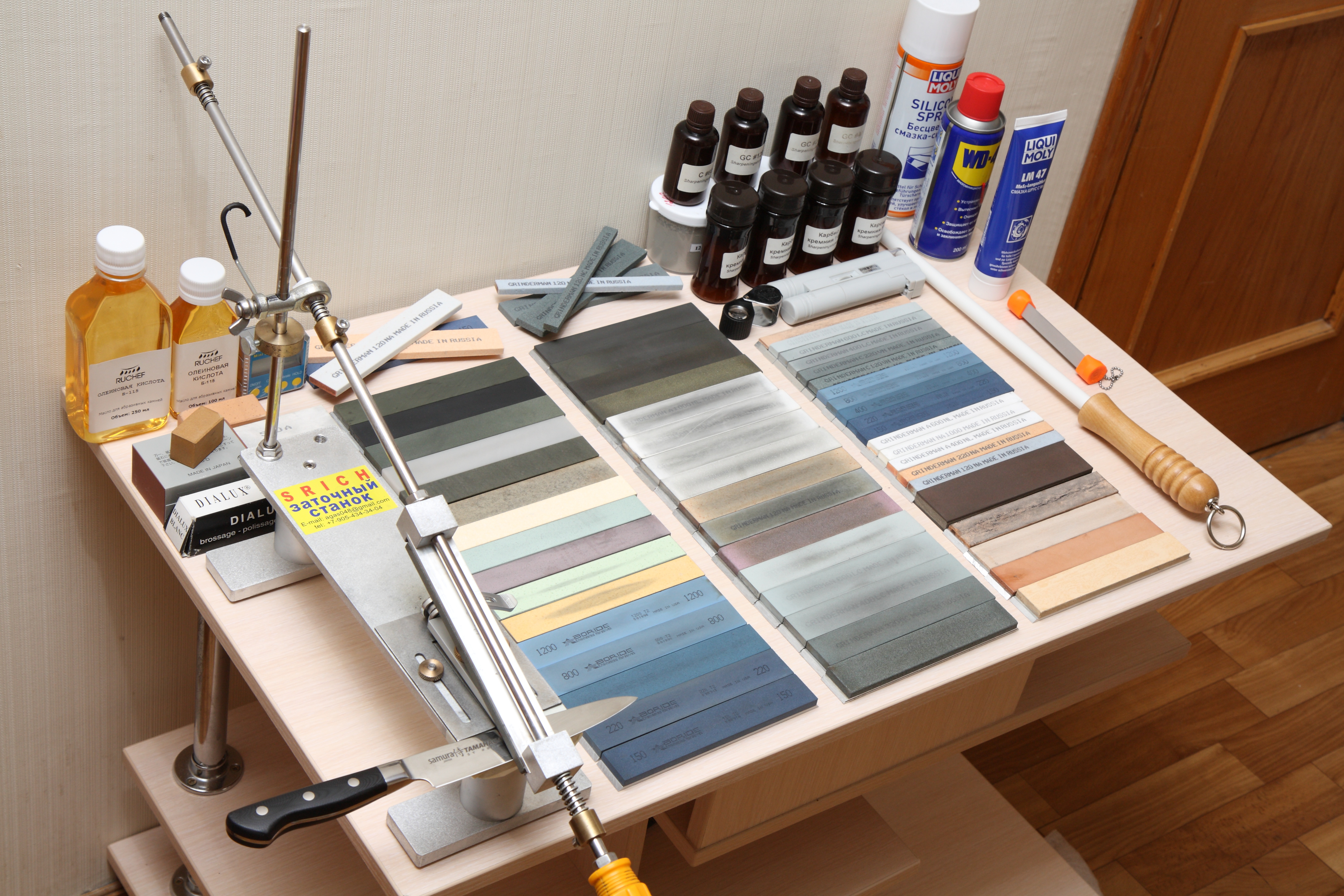 Кухонные ножи-способы заточки.Мой набор для заточки ножей, фоткал года 4 назад, сейчас камней есть поболее, но такое количество чисто для работы. Себе же можно иметь набор из 5 и финишный