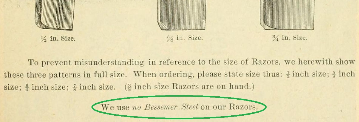 Буржуйские каталоги клинковых бритвЕще на первом рисунке бритв (стр.7) написано: „We use no Bessemer Steel on our Razors” – „Мы не используем Бессемеровскую сталь для наших бритв”: С 2013 г. с кайфом бреюсь опасной бритвой пять раз в неделю, в три прохода.