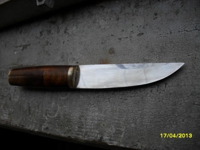 Re: Наши ножиМой пуукко, сделанный финским мастером. Традиционная форма, ручка из карельской березы, на конце грибовидный вырез. Рукоять лезвия проходит сквозь всю редервянную ручку и расклепана на конце. Спуски клиновидные, полуклин (или как там принято называть)