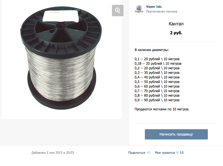 Любой кантал подойдет Этот можно очень долго ждать В Москве цена за 1м кантала стоит примерно 2 рубля Вот точные цены Думаю и в Питере есть но если вдруг нет то могу прислать хоть в конверте. "бухта" 0,4 кантала длинной в 10 метров весит до 10гр. Кстати на термоконтроле можно и стальку попробовать вкус довольно тоже неплохой. Олег Бритва писал: