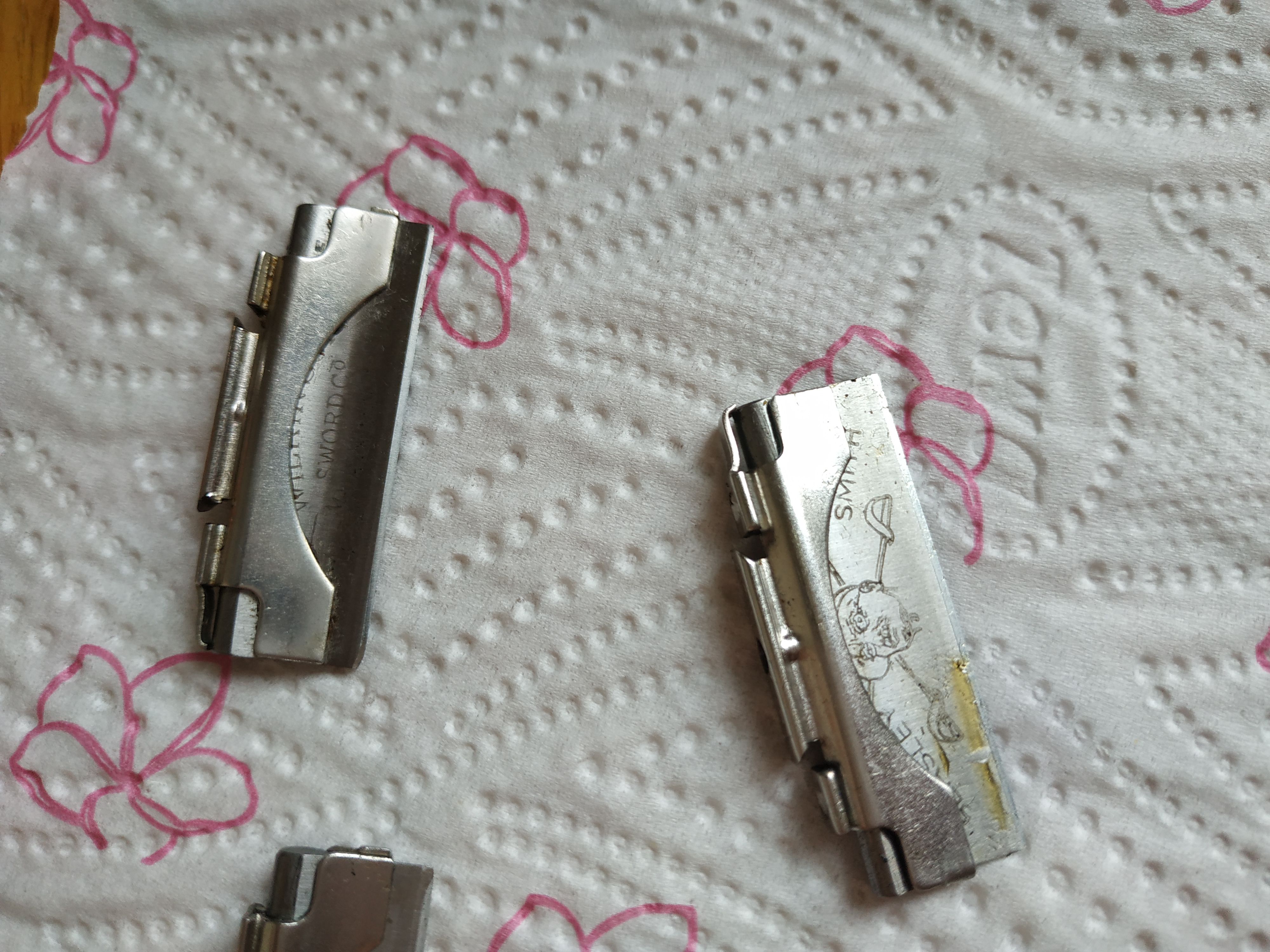 Ремни которые шли в комплектах, дали бы фору многим современным ремням Это те предметы , которые часто подвержены быстрому старению и порче. Найти ремни отдельно , не реально. Лично продавал ремни новые, за 80 долларов. У вас на фото, к сожалению , ремень не первой свежести. И судя по порезу в конце, человек был немного не с прямыми руками. Поэтому , это не комплект. Это бритвы примерно 48 года выпуска. Выпускались в нормальных количествах. Сохраны встречаются по причине того, что кому то подарили, а он ее в тумбочку положил. Но часто , джентельмены , немного ими пользовались . И не протирали. Это кстате это недостаток этой модели. Неудобно протирать лезвия. А после того как их оставляли не протёртыми, они внутри покрывались ржой. Но это так, для познания. Прикреплю фото своего ремня. Я вам оценил бритву, и указал среднюю цену. В свое время, я производил оценку брилей. И многие приходили , что бы я подтвердил их мнение. А не что бы я высказывал свое " бестолковое " Оценкаtagir.dn, Все понял, спасибо за очень развернутую консультацию. Доходчиво, с картинками =) Хорошо, когда есть люди с такими специфическими познаниями, где еще такую информацию найдешь..