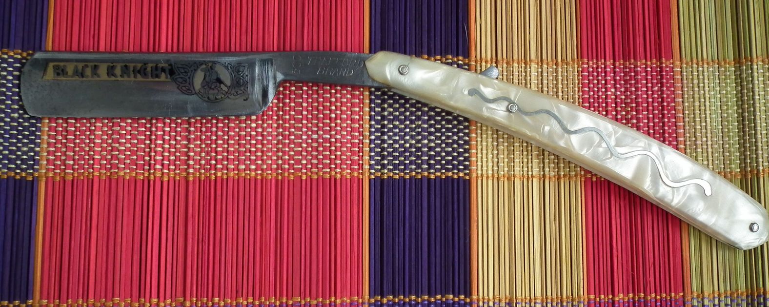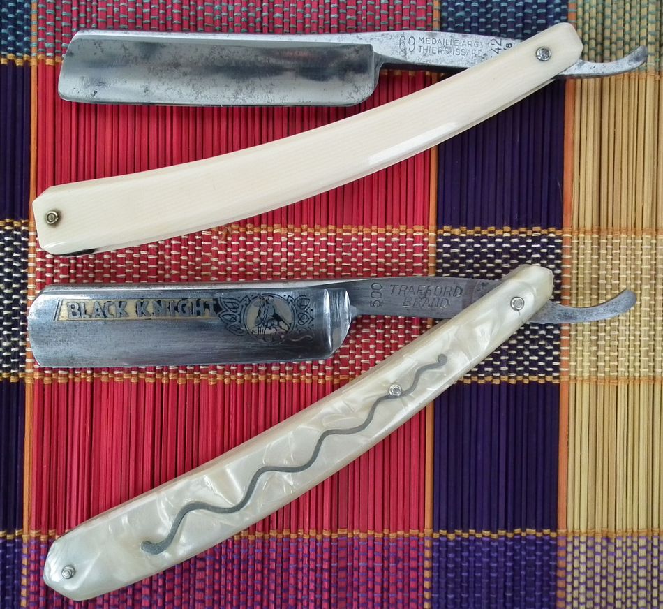 Верху вниз: 1:надписи: super gnome extra pour barbes dures / 69 medalle arg thiers issard 542 5/8 2:Black Knight 500 trafford brand. С другой стороны: finest silver steel made and ground in germany 3: Gelleferes Paris Fabricants 42 Являюсь полным профаном. Прошу оценить качество/изношенность/цену.