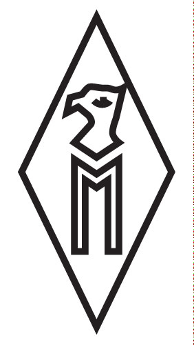 В ромбе буква "М" а над ней голова орла смотрящая в сторону.