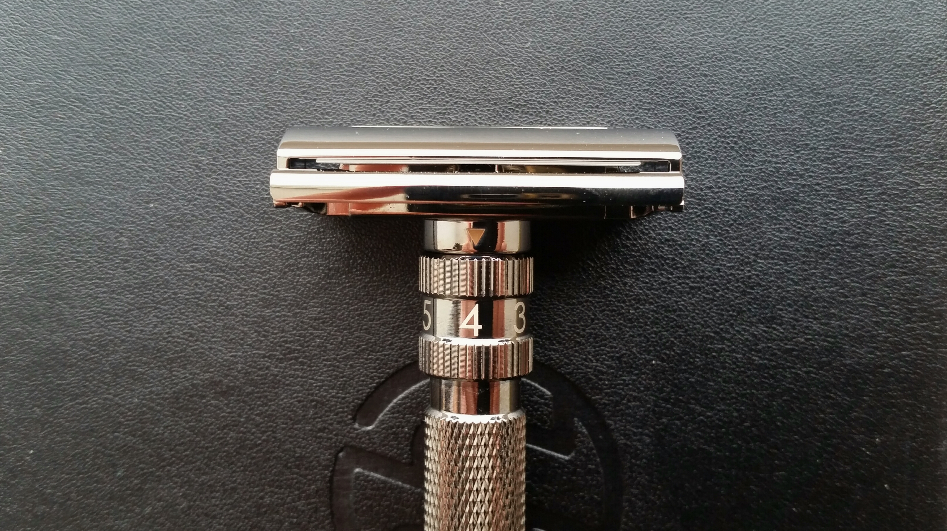 Механизм "бабочка", по принципу открытия и регулировки схож с Джиллетт и советскими копиями - поднятие и опускание опорной плиты (которая давит на лезвие снизу) с изменением гапа, вылета и наклона лезвия. Створки открываются/закрываются равномерно, кольцо регулировки тоже вращается плавно и с достаточным усилием. В закрытом виде можно вращать кольцо на понижение, на повышение я пробовал, но почувствовал сопротивление и прекратил (лучше чуть приоткрою механизм). Можно ставить любые промежуточные значения регулировки, в джиллетоподобных все значения фиксированы (1-9) и переключаются со щелчком. Тут же можно более точно подстроить под себя, что явно плюс, хотя и в варианте со щелчками регулировка обычно происходит с небольшим шагом изменения.