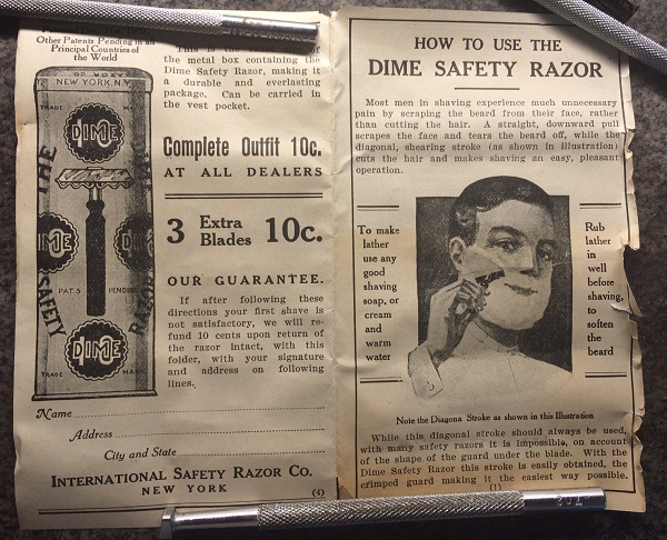 патент: Spoiler Show После, вплоть до 1915 года встречаются объявления упоминающие о продажах Dime safety razor. Я думаю, это агенты распродавали остатки еще пару лет. Так что бритва выпускалась с 1908 по 1910 или даже 1911 год, а потом, еще несколько лет, распродавались складские остатки.