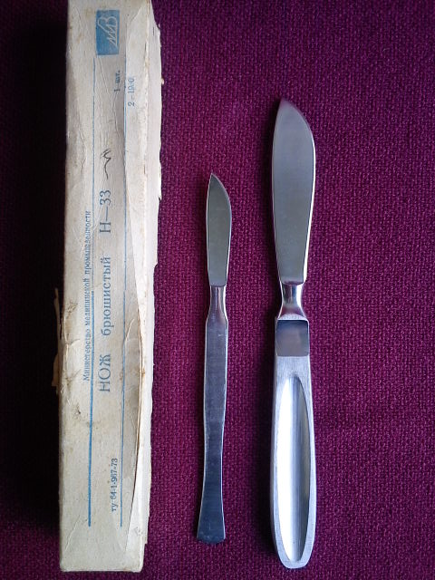 Re: Продаётся от RumataПродам два медицинских скальпеля.Производство СССР.Может кому в хозяйстве пригодится(начинающим хирургам,садистам и тд).Длина первого скальпеля 20,4 см,длина второго 16,2.Цена 20 евро(почта включена).