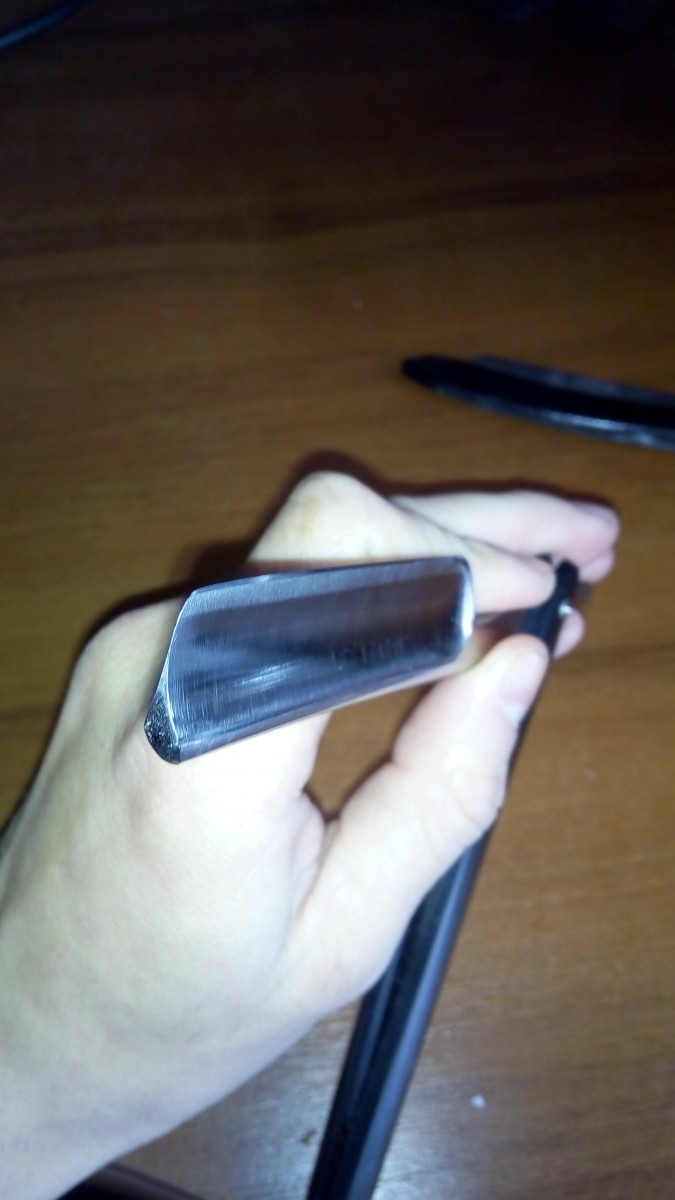 Re: Gold Dollar, TITAN (выбираем китайскую бритву)Впечатление от бритвы - в целом, бриться можно. По рабочим характеристикам я бы сравнил ее с новодельными DOVO. Бритва подойдет даже для постоянного регулярного бритья жесткой щетины. Заточка - не без проблем, очень медленный съем металла, может камни мои для этой стали не подходят. ТО в порядке, при заточке не крошится, заточку держит хорошо. После бритья, без направки, уверенный тест на волос. Визуально, клинок, топорная работа! Красавицей бритву сложно назвать, особенно с оригинальной ручкой. С новой ручкой ничего, похорошела