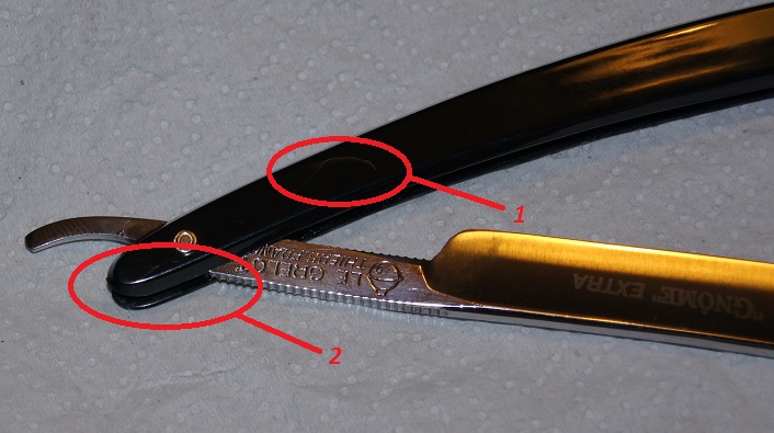 1. Начну с неприятного. После восторженных отзывов о качестве изготовления французами бритв, несколько обескуражил пришедший экземпляр. Цифрой "1" обозначен дефект на ручке, который я принял было за трещину, но, вроде, не она. Цифрой "2" обозначил сдвиг "щёчек" оправы друг относительно друга. Ось заклёпана кривовато. Интересно - это норма или эксклюзив? Жаль, конечно, впечатление немного подпорчено сразу, но мне она для бритья, а не на выставку. 2. Собственно, о бритье: чуда не произошло - лицо стало чисто выбритым... Но как она это делает... такое мягкое и удобное бритьё не даёт ни один Шефилд. Бритва очень маневрена, в руке сидит, как-будто делали именно для меня (наверное, эксклюзив корявый под мои руки 3. Заточка. Через десять дней пути, бритва сечёт волос в 10-12 мм от пальцев очень легко. Отлично заточенная бритва - низкий поклон мастеру Резюмирую: имея такую бритву, нет смысла тратиться на другие, ибо лучшее - враг хорошего!!! (Если, конечно, не собираете коллекцию). Глубина понимания определяется степенью заблуждения...