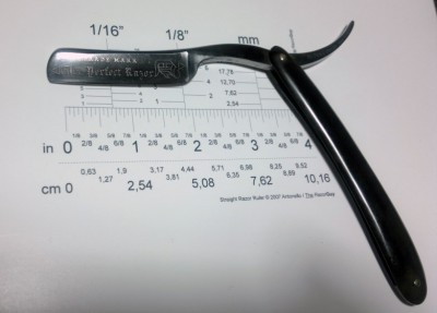 про длину: стандартная длина бритвы примерно 3 дюйма. или 7-7,5 см, и таких бритв 99% на рынке. По этому, по умолчанию, подразумевается такая длина. А эти плюс минус 0,5 см никто не замеряет - незачем. Но есть целая группа бритв коротких, от 1,8 до 2,3 дюйма. Они так и называются - карликовые бритвы или бритвы для усов. Длина такой бритвы, конечно, оговаривается отдельно. Добавлено спустя 7 минут 42 секунды: гм... просмотрел(( Франс уже ответил...