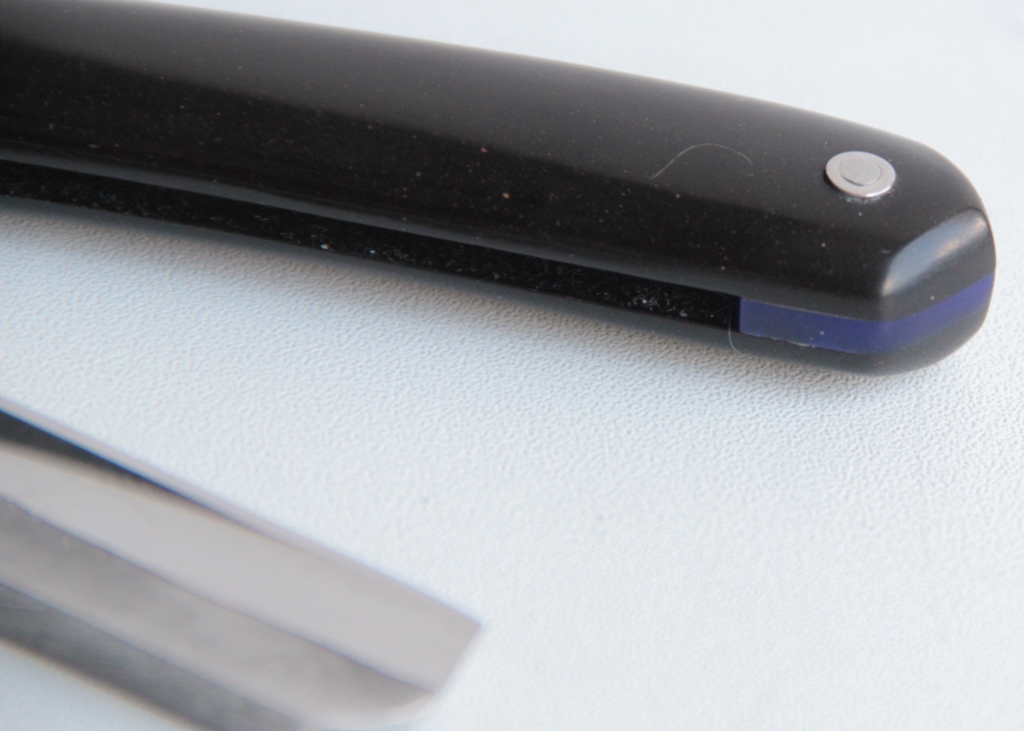 Как я понял, бритва была уценена в связи с тем, что "верхняя кромка заточки углом на обушке".  Данная фраза мастера мне просто взорвала мозг, о чем я не поленился спросить у более опытных товарищей. В результате консультаций мы пришли к выводу, что при заточке без изоленты на обушке образуется острый угол, способный каким то образом повредить ремень при правке..