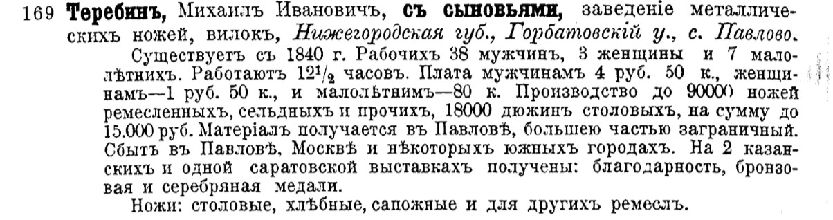 В 1908 г. сыновья основателя – Алексей и Василий учредили торговый дом «М.И. Теребина сыновья». На окраине Павлова, на собственной и арендованной у крестьянского общества земле братья Теребины поставили кирпичные производственные корпуса, оснастили их многочисленными станками, паровым и нефтяным двигателями. К этому времени уже были отделения фабрики в селе Вареж Муромского уезда Владимирской губернии, селе Селитьба и деревне Вязовка Горбатовского уезда Нижегородской губернии К 1914 г. фабрика Теребиных превратилась в одно из крупнейших предприятий не только Павлова, но и всего сталеслесарного района. В 1913 г. стоимость основных фондов фабрики достигла 81 000 рублей, а совокупная мощность силовых установок составляла 215 л. с. Производили Теребины широкий ассортимент сталеслесарных изделий: столовые, кухонные, складные и промысловые ножи, кинжалы, ножницы, топоры, слесарный и пчеловодческий инструмент.