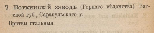 • Металлургический завод основан в г. Воткинск в 1759 году. Позже появились цеха по выпуску металлоизделий начиная от тонкой проволоки и часовой пружины до корабельного листа и 300-пудового якоря. Воткинские слесаря изготовляли стальные печати, бритвы, столовые и перочинные ножи, ножницы и даже дамские браслеты.