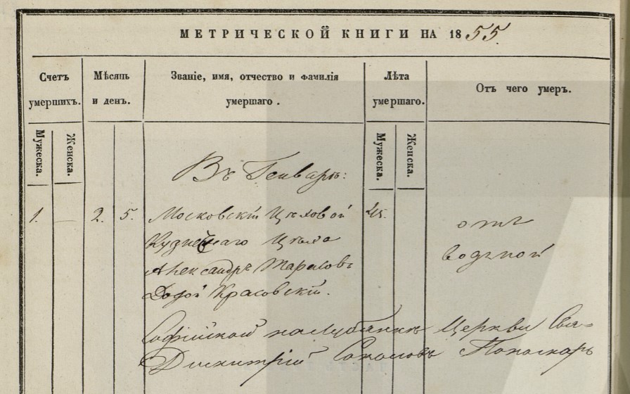 Умер в январе 1855 года, в возрасте 45 лет, от "водяной болезни", похоронен на Пятницком кладбище, в Москве