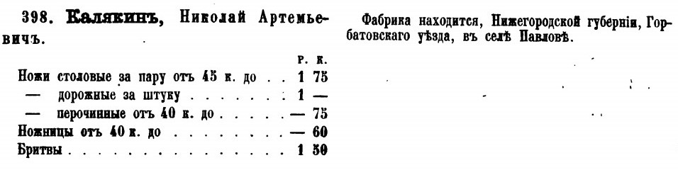 сущеетвуетъ съ 1816 года. Учредитель его, Иванъ Игиатьевичъ Калякинъ, началъ съ мФдшхъ заикоаъ н клинчей и только въ посл'Ьдствш сталъ выд'Ьлыватъ столевые и перочиные ножи, ножниш и бритвы. Теперь заведетемъ управляетъ его сынъ. Оборотъ его простирается до 10.000 р. въ годъ. Рабочяхъ въ завесешн 14 челов'Ькъ, да на сторон1Ь работаетъ до 20 челоъънъ. При даведен1и 6 верстаковъ, 5 точильныхъ колесъ, приводимыхъ въ движете коннымъ проводонъ в одно ручное. Изд'ЁЛ1я Калякиныхъ на вс1Ьхъ выставкахъ получали награды, а въ 1847 году удоетоени быт права првкладкватъ къ евоимъ изд'блямъ государствеяый гербъ, въ воздаянге за 35-л1&тиее занЕпе выдФлкой ножей и бритвъ и обучеше этому мастерству до ста челов'Вкъ.http://www.archive.org/stream/pismaoput ... g_djvu.txt" onclick="window.open(this.href);return false; (цена на бритвы отъ 4 руб и выше дюжшва) Калякин. Заведение существует с 1810г. Учредитель его Ив. Игн. Калякин начал с медных замков и ключей, впоследствии стал выделывать столовые и перочинные ножи, ножницы и довел свое изделие до возможного совершенства. После его смерти заведение перешло к сыну Арт. Ив.Калякину, в заведывании которого находится и поныне. Самое значительное его производство - столовые ножи, затем перочинные ножи и бритвы. В его заведении 14 ч. рабочих и на стороне до 20 ч.; при заведении 6 верстаков, 5 точильных колес, движущихся конным приводом, и 1 ручное. Годовой оборот простирается до 10 т. р. сер. За выделку стальных изделий Калякины получили следующие награды: 1., 22 января 1837 года за поднесенные через министра финансов государю императору столовые и перочинные ножи от высочайших щедрот в поощрение 1о0о р. ассиг. из государственного казначейства; 2.,на С.-Петербургской мануфактурной выставке 1839 года серебряную медаль с надписью «За полезное», для ношения на шее. На этой выставке куплено у него стальных изделий для императорской фамилии на 340 руб., и мастер был удостоен приглашения к назначенному по высочайшему повелению обеденному столу в Петергофский загородный его императорского величества дворец; 3., на Московской мануфактурной выставке 1843 года серебряную медаль с надписью «За полезное», для ношения на шее на аннинской ленте; 4., на С.-Петербургской мануфактурной выставке 1849 года за отличное ножевое изделие малую серебряную медаль 5., по представлению министра финансов, по Положению комитета министров, высочайше утвержденному 31 января 1847 года, предоставлено право прикладывать на свои изделия государственный герб за 35-летнее занятие выделкой ножей и бритв и обучение этому мастерству до 100 человек. http://docs.google.com/viewer?a=v&q=cac ... ITwByrWa8g" onclick="window.open(this.href);return false;