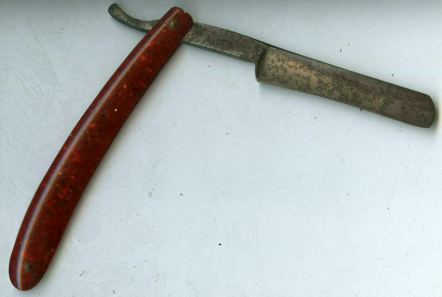 Вот такая вот опасная бритва попалась , конкретно отнести к какому-то определенному производителю затрудняюсь. Да и страна для меня загадка.От ржавчины более и менее отбил слабым электролизом, раковин нет , но пятна по-оставались .