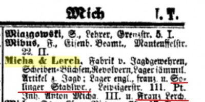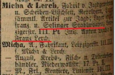 viewtopic.php?p=211068#p211068 По поводу Franz Lerch. Нашелся тезка, но очень похоже, что это он. Слишком много пересечений и Берлин и улица и бизнес. Фирма Micha & Lerch, присутствуют в адрессбухе Берлина в 1875 и 1877 годах. Anton Micha и Franz Lerch, охотничьи ружья, винтовки, револьверы, стоковые товары. Производство в Золингене, (Solinger Stahlwaren) Нашлись и их столовые ножички на одном из аукционов: Spoiler Show Бритвы гораздо позже 1870х годов, похоже что герр Franz Lerch на стыке веков начал самостоятельный бизнес в соседнем доме. Надо адрессбухи Берлина поискать за 1900-е года, пока не нашел. Franz LerchА вот, кстати, на коробочке написано дом 103, а не 130. нашелся Franz Lerch по этому адресу, в адрессбухе по Берлину за 1903 год