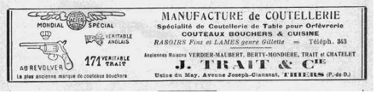 в 1926 году зарегистрирован по адресу: Thiers, 9 rue Mancel Chabot 1937 год, уже "J. Trait & Cie": под названием фирмы написано: usine du May, avenue Joseph-Сlaussat. (фабрика "du May", авеню Joseph-Сlaussat) По этому же адресу, с таким же телефоном 343, но уже в 1954 году указан владелец - Claude Chatelet (Клод Шатле - сын?) Сейчас из этой фабрики сделали музей. Из википедии: Завод был открыт в мае 1895 года ножевой компании Paris Grange Young J. Lepage. Эта компания прекратила торговлю около 1900. Именно с этого периода , площади сдаются в аренду ремесленникам под небольшие мастерские. торговая марка - пистолет с короной, 1954 год: Spoiler Show торговая марка - бюст английского солдата и надпись VERITABLE ANGLAIS торговая марка - 171 INOXYDABLE Spoiler Show Spoiler Show