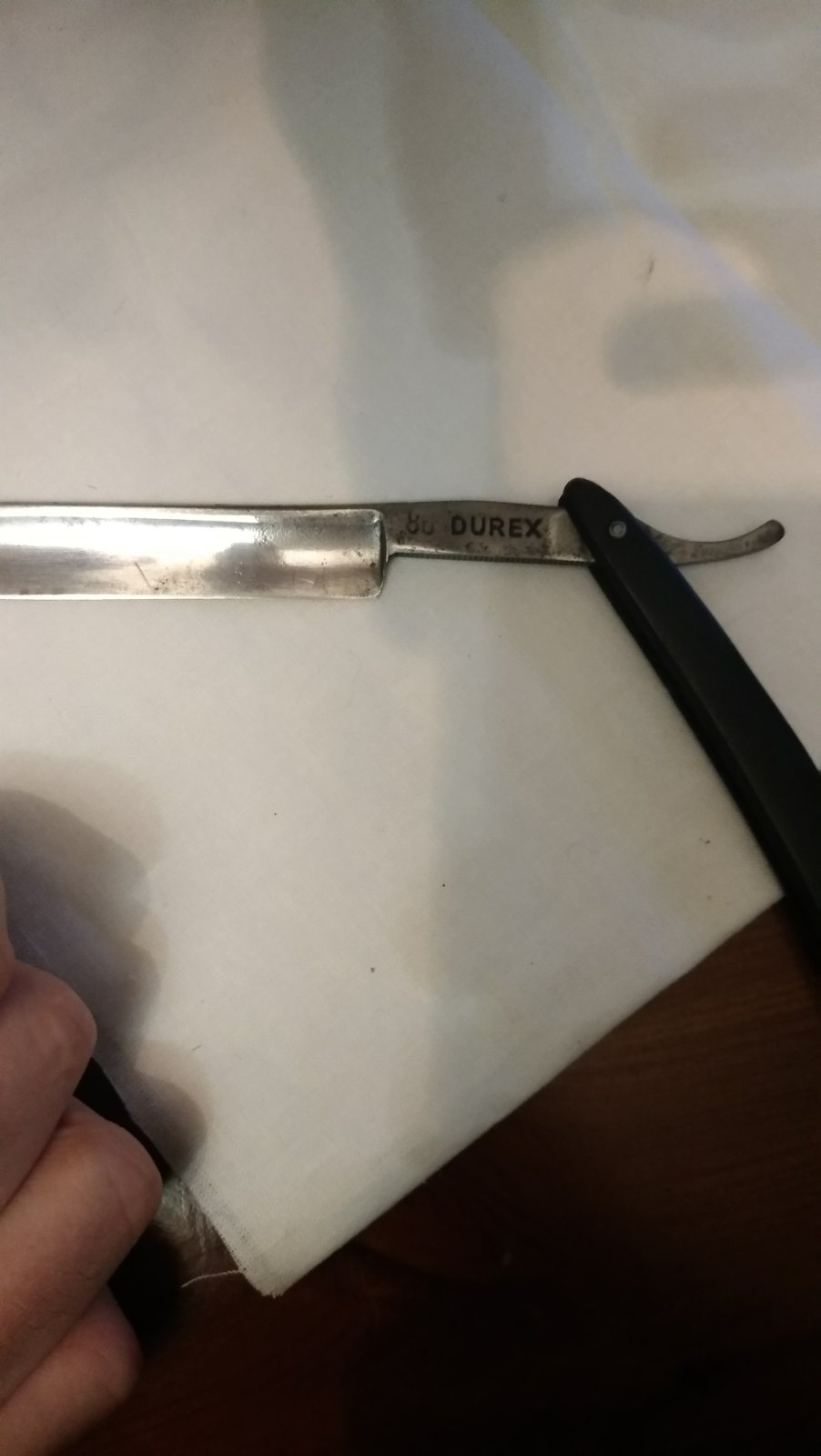 С опасными бритвами я не так давно. Недавно решил взять что-нибудь на блошином рынке на поиграться для восстановления и заточки. Нашел бритву достаточно сточенную уже, но вроде живую. Немного привел в чувство. Теперь стало интересно можно ли примерно определить период выпуска. Коробка скорее всето не родная - зеленая, Solingen и надпись Durex двойная. На самой бритве ничего кроме Silberstahl Solingen нет. С подводов убрана вся коррозия, заточена для бритья. Посмотрим как будет держать заточку, так как были предположения, что давно над ней поработали очень грубо. Когда отчистил пастой стали заметны очень грубые риски. Насколько понимаю, без клейма говорить о производителе бесполезно. Может хоть период времени... Ручка уж больно хлипкая - тонкий целлулоид с просветкой в нескольких местах "под янтарь". Бритва шелестит почище моей новой Дова прима.