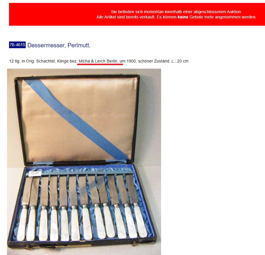 viewtopic.php?p=211068#p211068 По поводу Franz Lerch. Нашелся тезка, но очень похоже, что это он. Слишком много пересечений и Берлин и улица и бизнес. Фирма Micha & Lerch, присутствуют в адрессбухе Берлина в 1875 и 1877 годах. Anton Micha и Franz Lerch, охотничьи ружья, винтовки, револьверы, стоковые товары. Производство в Золингене, (Solinger Stahlwaren) Нашлись и их столовые ножички на одном из аукционов: Spoiler Show Бритвы гораздо позже 1870х годов, похоже что герр Franz Lerch на стыке веков начал самостоятельный бизнес в соседнем доме. Надо адрессбухи Берлина поискать за 1900-е года, пока не нашел. Franz LerchА вот, кстати, на коробочке написано дом 103, а не 130. нашелся Franz Lerch по этому адресу, в адрессбухе по Берлину за 1903 год