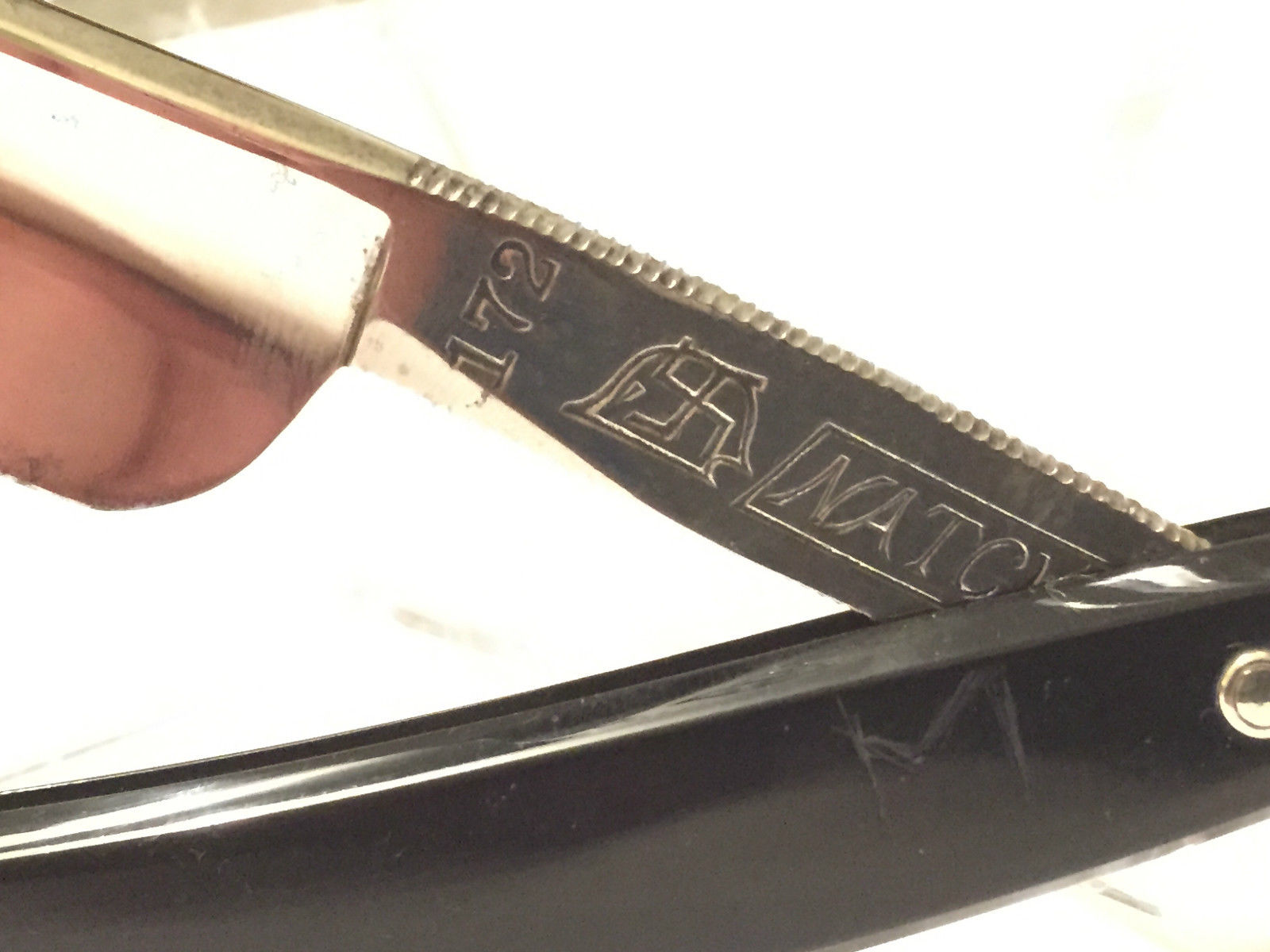 Vintage Natch Japanese 6/8 Straight Razor No. 172. For Barbers Use and made from Best Tamako Steel. The razor is in fine condition and has Nazi Swastika & Storm Trooper Helmet markings, which must date it to the 1930's 40's. ******************* This is a fine razor in its own right the historical markings add to its interest. Но мне кажется тоже, что пропаганда нацизма и его идеологии в данном случае отсутствует.