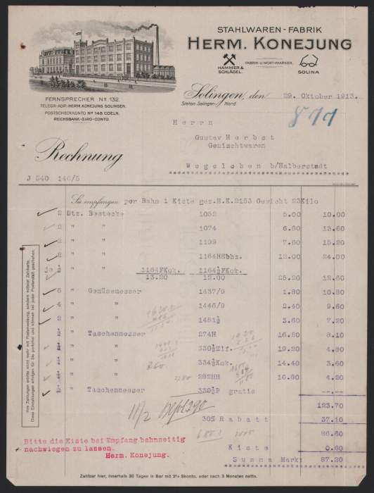 В 1939 году фабрика находилась на Cronenbergerstrasse, 60. В 1986 году на Schlagbaumerstrasse, 67 и в 1998 году на Kleine Kamperstrasse, 11a. Торговые марки: Solina (пат.№64644 в 1903 году), Arco, Boven, Hammer&Schlägel (hammer&mallet), Herko, Hermko, Hermako, Hannovera, Ora, Stahlberg, Stahlmann, Towerstar, Wetterhahn (weather cock). Продолжение следует...
