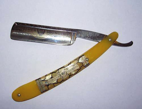 Ручка пластмассовая, желтая с инкрустацией серебром и перламутром, надписью «GLOBUSMEN SOLINGEN» c одной стороны. Бритва в идеальном состоянии. Имеет оригинальную упаковку с надписями: «Edmund Bergfeld & Sohn», «With the best silver steel of the world», «Globusmen Gold SOLINGEN», «Extra 46». Хочу получить подробную информацию о данной бритве. Фотографии бритвы можно увидеть ниже: