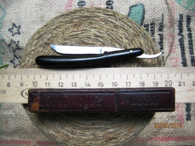 Олег Бритва: Манфред такую бритву тебе тогда показывал. И форма именно, как у ножичка. Он нам тогда объяснял, что такие бритвы использовались для снятия мозолей, вскрытия фурункулов и т.д. После этого он нам показал гигантскую бритву - ветеринарную. Но это всё из области раритетов.