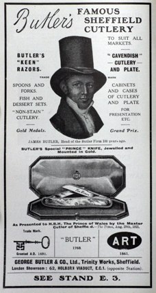 1929 год. «British Industries Fair» устраивает выставку «World Famous Sheffield Cutlery and Silver Plate» (дословно «Всемирно известные шеффилдские ножи и столовое серебро»), где Butler показывает торговую марку «Cavendish», столовые ножи «Non-Stain», вилки, ложки, карманные и спортивные ножи, ножницы, футляры и ящики, бритвы «Keen», безопасные бритвы, лезвия, ножи повара и мясника, рыбные и десертные приборы (Ножевая секция, стенд J52).