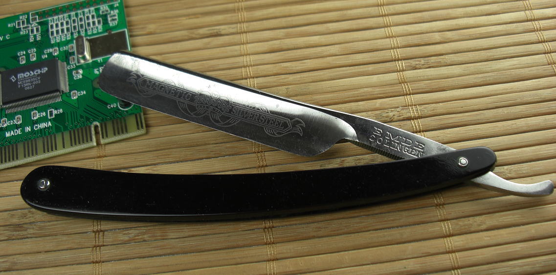 Очень красивая, состояние - супер, но почему-то трещина во всю харю! Обидно. Такого раньше никогда не видел. Длина повреждения - около 20 мм, на расстоянии от кромки - 10 мм. Или её уронила уборщица, или впарили такую, я просто не заметил. Не просто Silberstahl, а Magnetic. Ремонт опасных бритв, звонить с 11-00 до 23-00, +79267729357, (whats app, telegram, VK), спросить Олега.