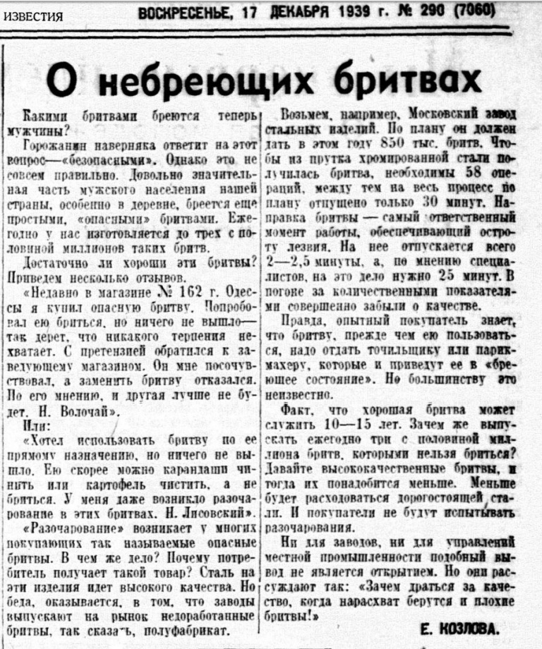 По поводу не заточенных бритв. Как была проблема в 1939 году, так ничего и не изменилось.