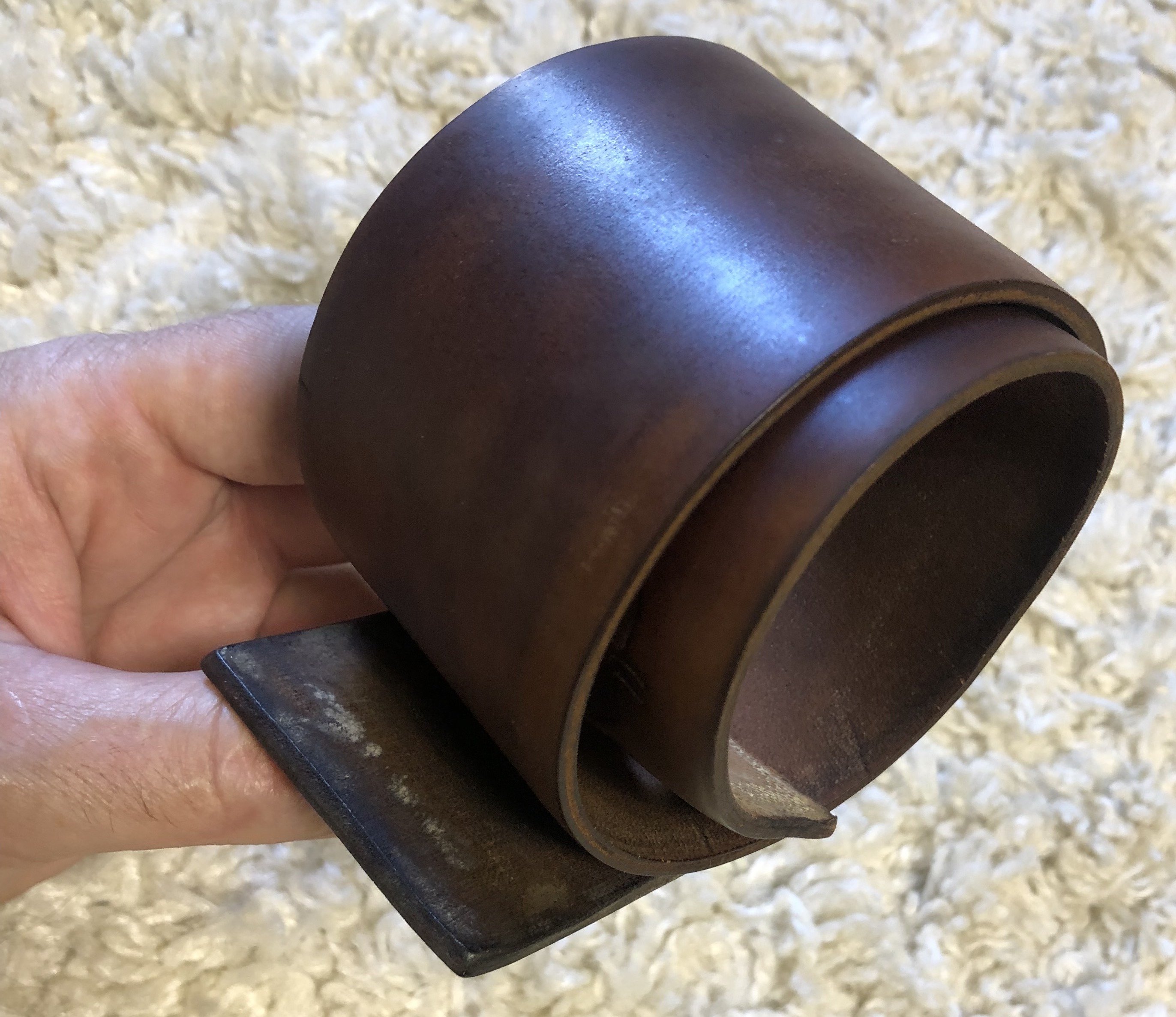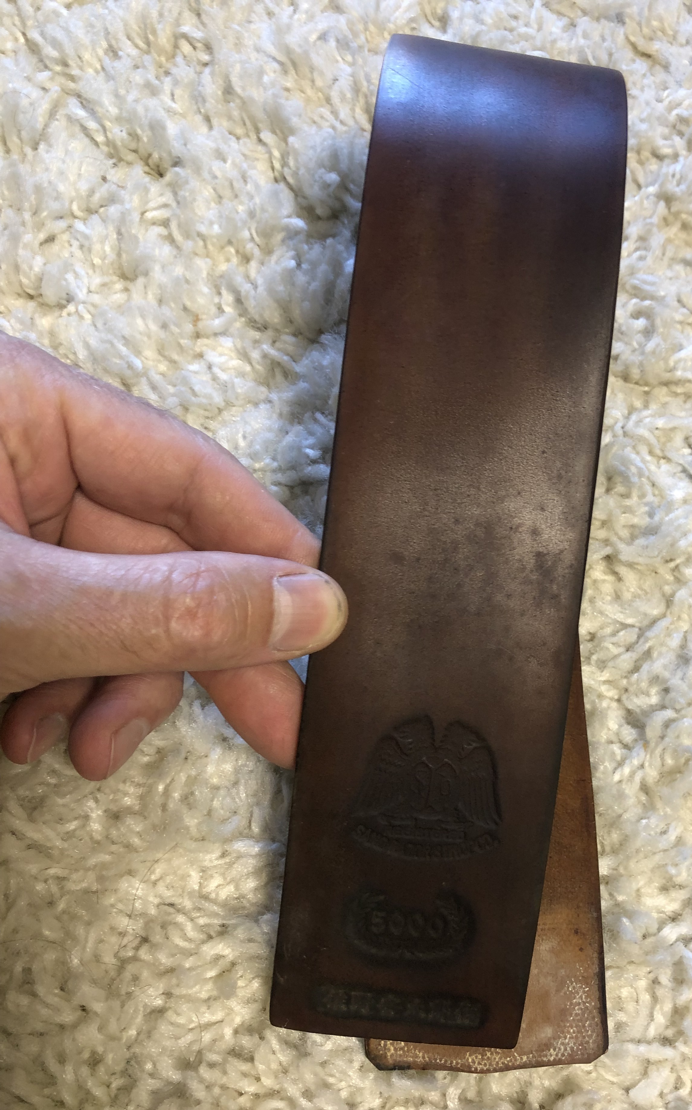 Специально ничего не делал с кожей, чтобы было видно исходное состояние лошади.Немного суховат,жестковат, хотя эластичность сохранилась. Есть микротрещинки на обратной стороне кожи. Сам кордован в хорошем состоянии,без порезов, шрамов, заломов и др.Требуется шлифовка и пропитка костным маслом. После реставрации можно использовать в качестве подвесного ремня, либо , что ещё лучше, в качестве колодочного или натяжного.