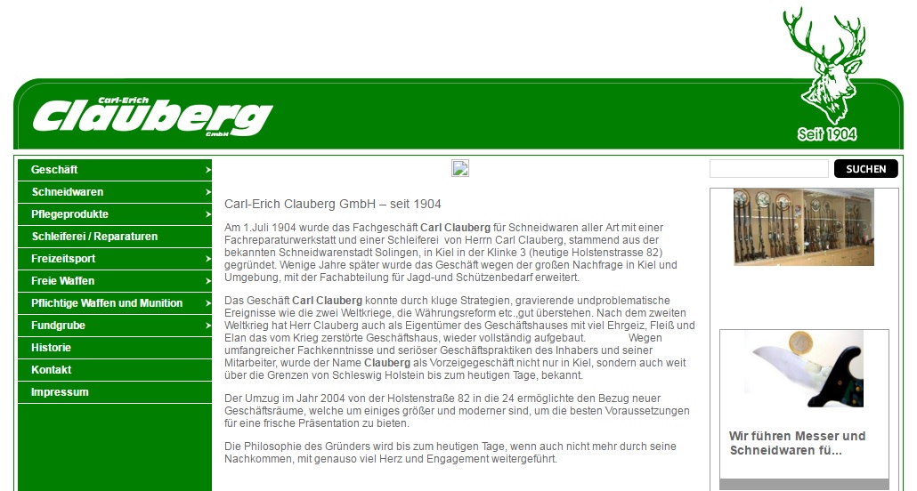 Am 1.Juli 1904 wurde das Fachgeschäft Carl Clauberg für Schneidwaren aller Art mit einer Fachreparaturwerkstatt und einer Schleiferei von Herrn Carl Clauberg, stammend aus der bekannten Schneidwarenstadt Solingen, in Kiel in der Klinke 3 (heutige Holstenstrasse 82) gegründet. Wenige Jahre später wurde das Geschäft wegen der großen Nachfrage in Kiel und Umgebung, mit der Fachabteilung für Jagd-und Schützenbedarf erweitert.
