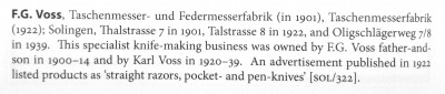 F. G. Voss SolingenОб этой фирме известно не много. с 1900 по 1914 годы бизнес принадлежал F.G. Voss и сыну с 1920 по 1939 год владельцем был Karl Voss (с 1914 по 1920 - Первая Мировая война, вероятно бизнеса не было или данные отсутствуют) адреса в Золингене: Thalstrasse 7 в 1901 году, Taistrasse 8 в 1922 году, Oligschlagerweg 7/8 в 1939 году. Из рекламы 1922 года ( на картинке выше) видно, что занимались карманными, перочинными ножами и бритвами. источник: справочник J. A. Carter Spoiler Show Кто сейчас на конференцииСейчас этот форум просматривают: нет зарегистрированных пользователей и 6 гостей | |