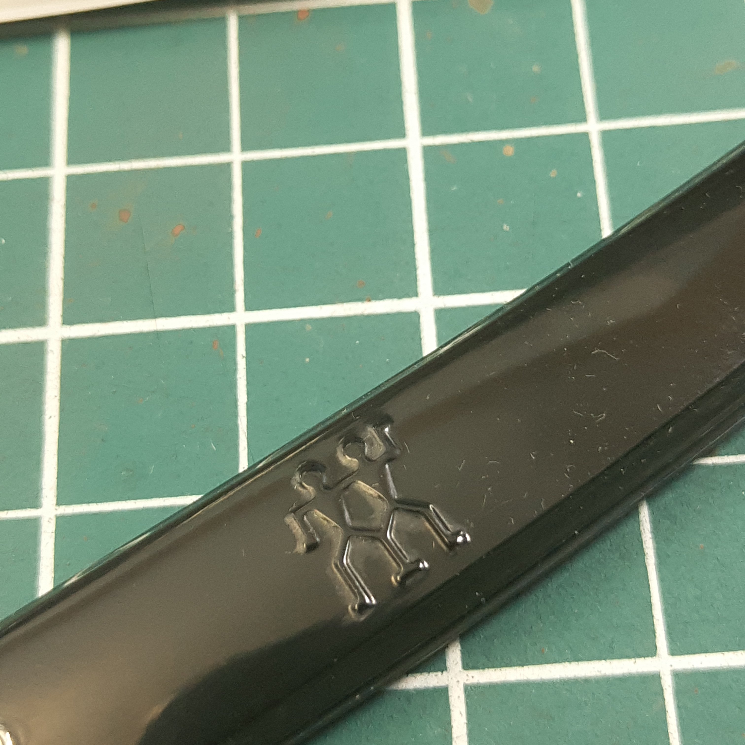 Прокладкой между частями ручки служит свинцовый металл. К сожалению, такие перламутровые ручки довольно хрупки. Большая удача для современного коллекционера – найти образец этой красивейшей ручки без трещин и сколов. Мне повезло найти две такие бритвы, но обе были со сломанными ручками. Было отмечено, что ручки были разных размеров под разную ширину бритв.