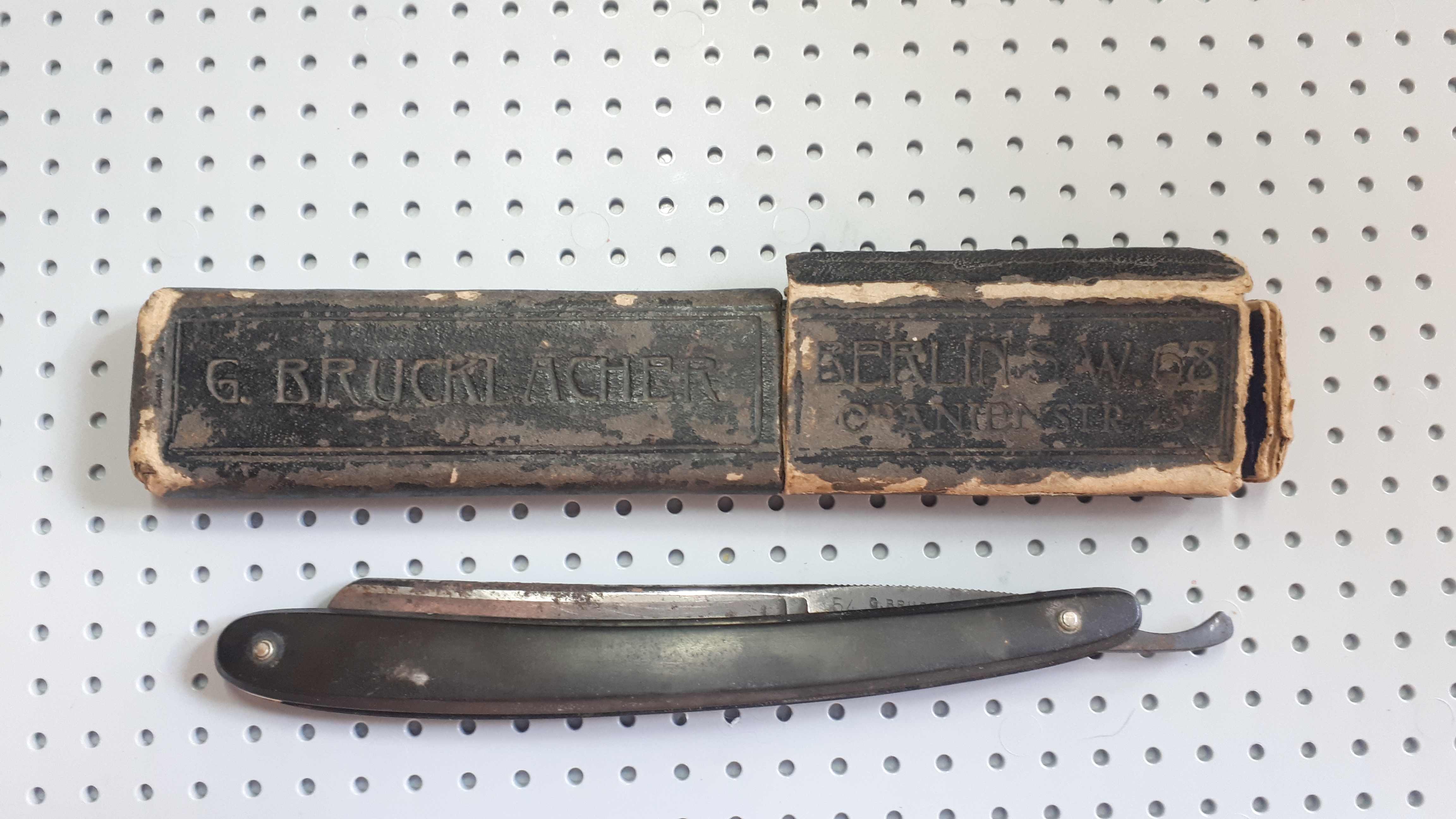 в разделе STAHLWAREN (изделия из стали) в подразделе ginzelhandel (розничная торговля) есть такой Brucklacher G по указанному на коробочке адресу Бритва довоенная, сделана по заказу владельца магазина скобяных товаров Brucklacher G фирмой Willy Bracht (торговая марка Bradrei). Стоимость бритвы чуть больше нуля.